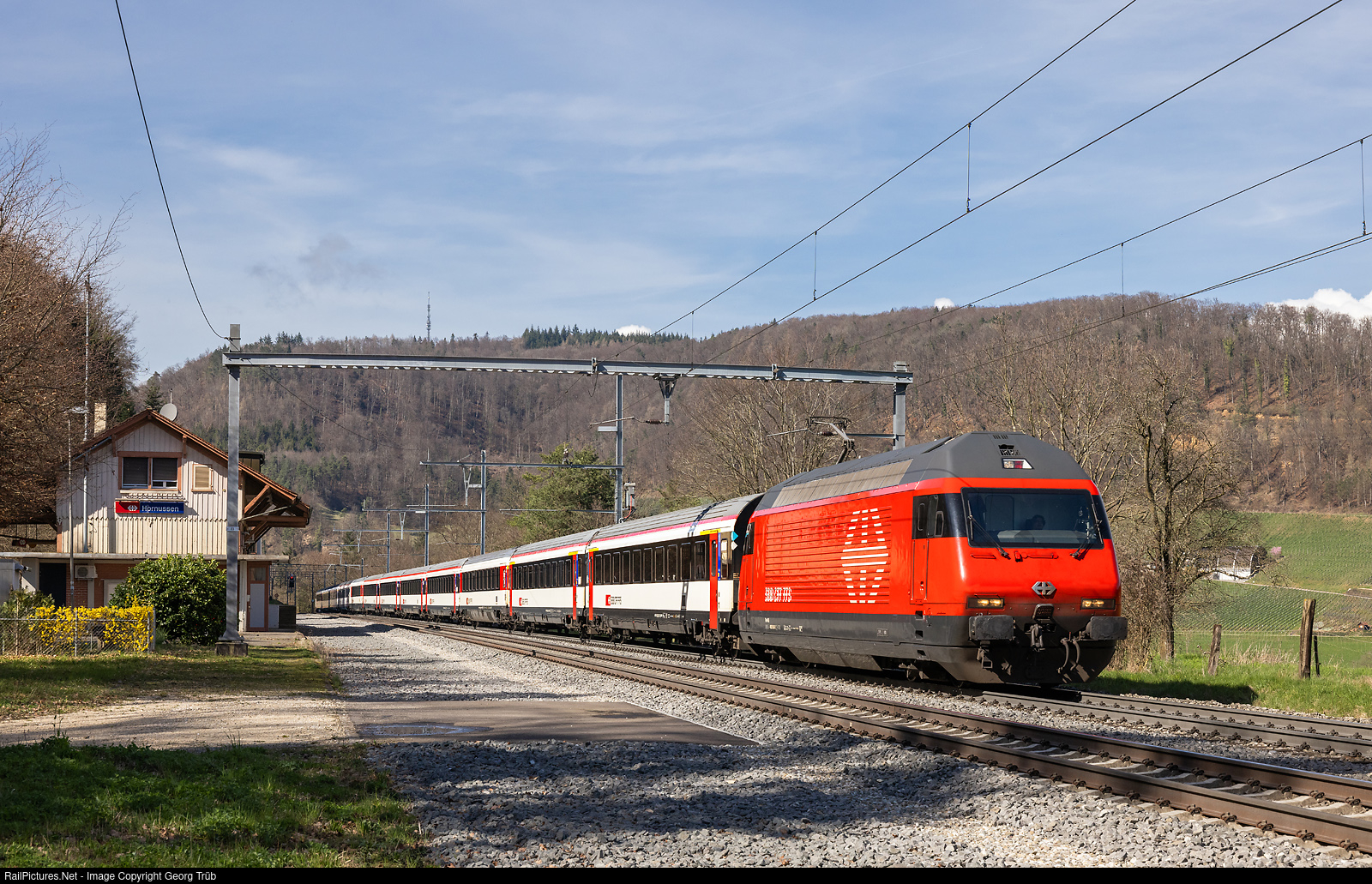 | Re 460 # 049 of the SBB pulls a rather long push-pull train trough Hornussen on the Bözberg north ramp. This is the IR 1973 of the Line IR36 from Basel via Rheinfelden-Stein-Säckingen-Frick-Brugg-Baden to Zürich. The 8 car train with standard cars of type IV, Bpm/Apm and Bt is reinforced in the rear with a 5-car "modul" including another Bt cab car. |
