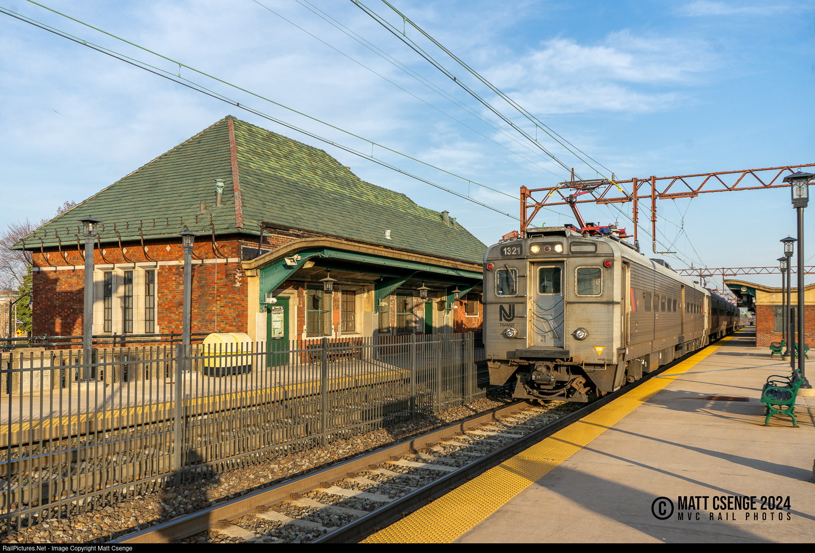 Racing past the low-level platform at East Orange Station is NJ Transit Arrow III EMU no. 1321, leading Gladstone Branch train 433. The historic station house seen here was built in 1922 when the line was grade-separated and elevated above the roadways below. |