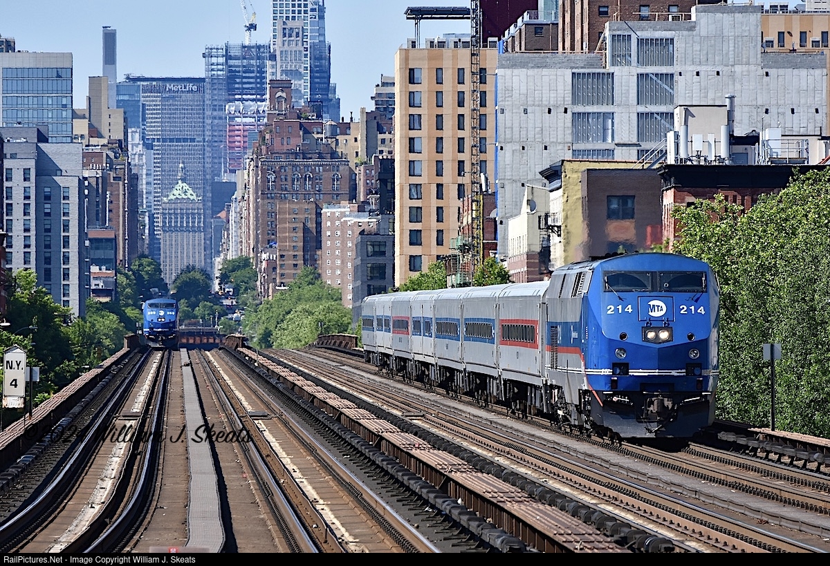 | Equipment train 2715 with P32AC-DM 214 and seven Bombardier cars heading back to Croton Harmon on Track 4. Another equipment train heading towards Harlem-125th Street Station on Track 2 with P32AC-DM 209 in the lead. |