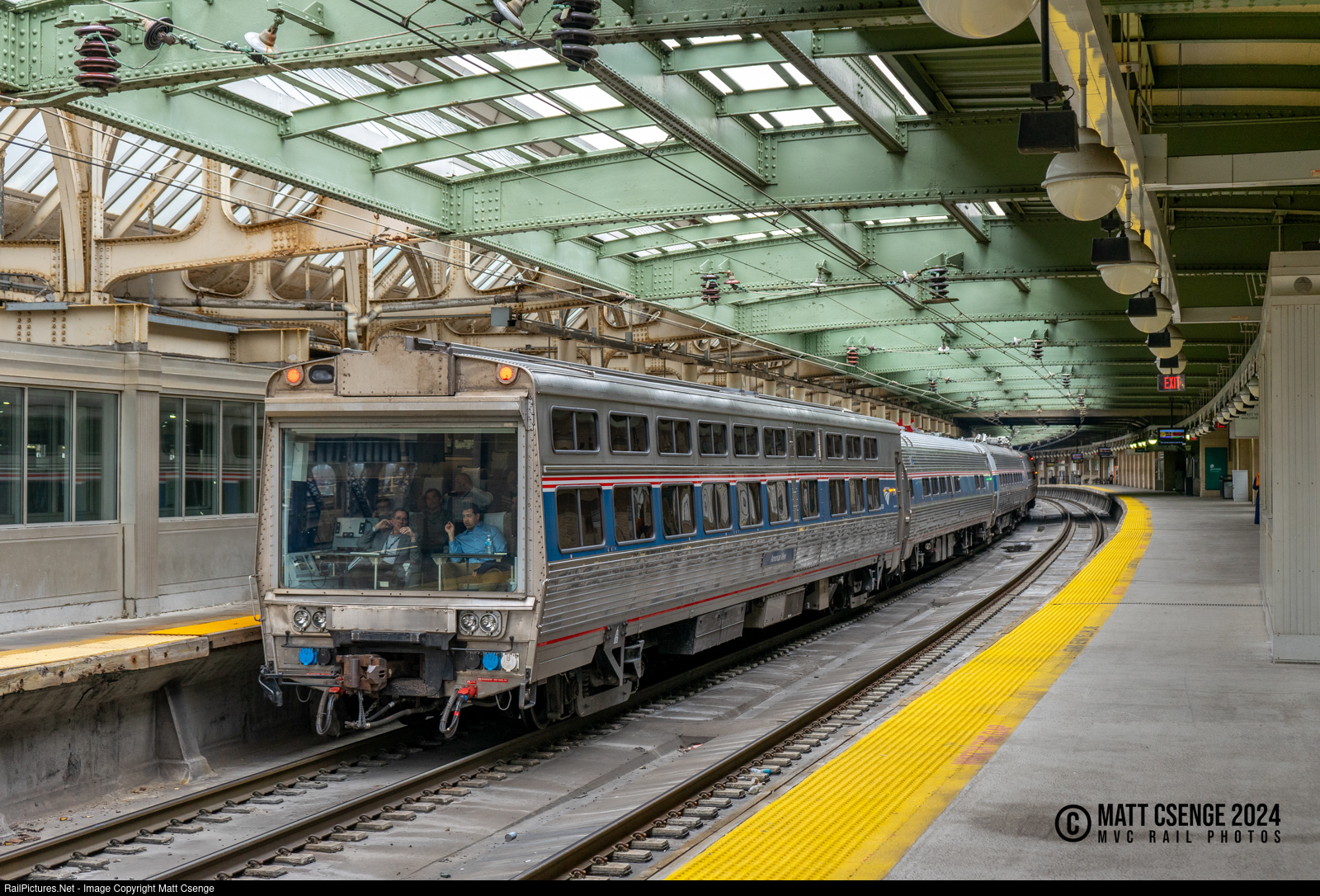 Amtrak View liner inspection car 10003, the American View, is seen on the rear of Northeast Regional train 171, bound for Washington DC. The massive window provides inspectors and other Amtrak officials and guests with panoramic views of the track and right-of-way as the train cruises the network. Ahead of 10004 are two other inspection cars: geometry inspection car 10003, the Corridor Clipper, and catenary inspection car 10005.