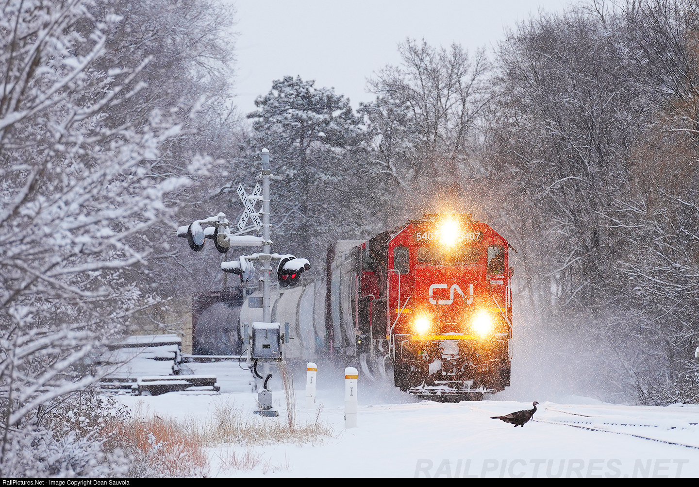 Train L517 is charging through the fresh snow at New Richmond, WI on CN's Minneapolis Sub. A wild turkey shows no alarm as it strolls leisurely across the mainline. The rest of his rafter was already across and he too would make it despite the crossing lights and horn. There hasn't been much snow here this winter so the snowfall was a nice break.