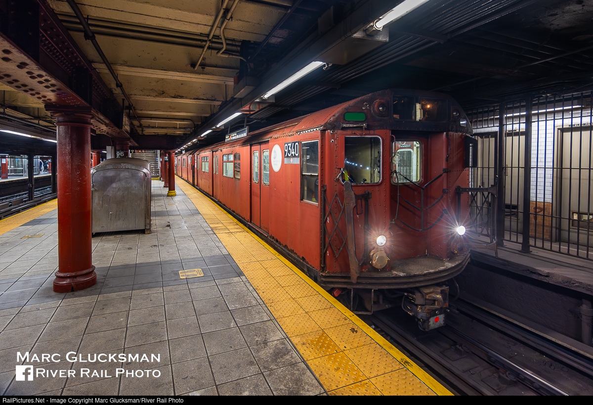 Redbirds Ride On. On the the night of Friday, March 22, 2024, Metropolitan Transportation Authority - MTA NYCT Subway R-33S 9340 (St. Louis Car Company, 1963) was at the north end of a work motor transfer from 239 Street Yard to 207 Street when it paused at 96 Street-Broadway on the 1 Line to change ends. This car has been serving the subway for over 60 years, split about 2/3 for revenue and 1/3 non-revenue service, which includes work and refuse trains. The iconic "redbird" color was first applied in the mid-1980s as part of the graffiti free program, and became synonymous with the return of the system's state of good repair. Several examples are preserved in the New York Transit Museum collection, including 9310, a sister to this car, which is on display at the former Court Street station in Brooklyn, New York. The cars were coupled to a 5-car set of R-62 cars for the move.