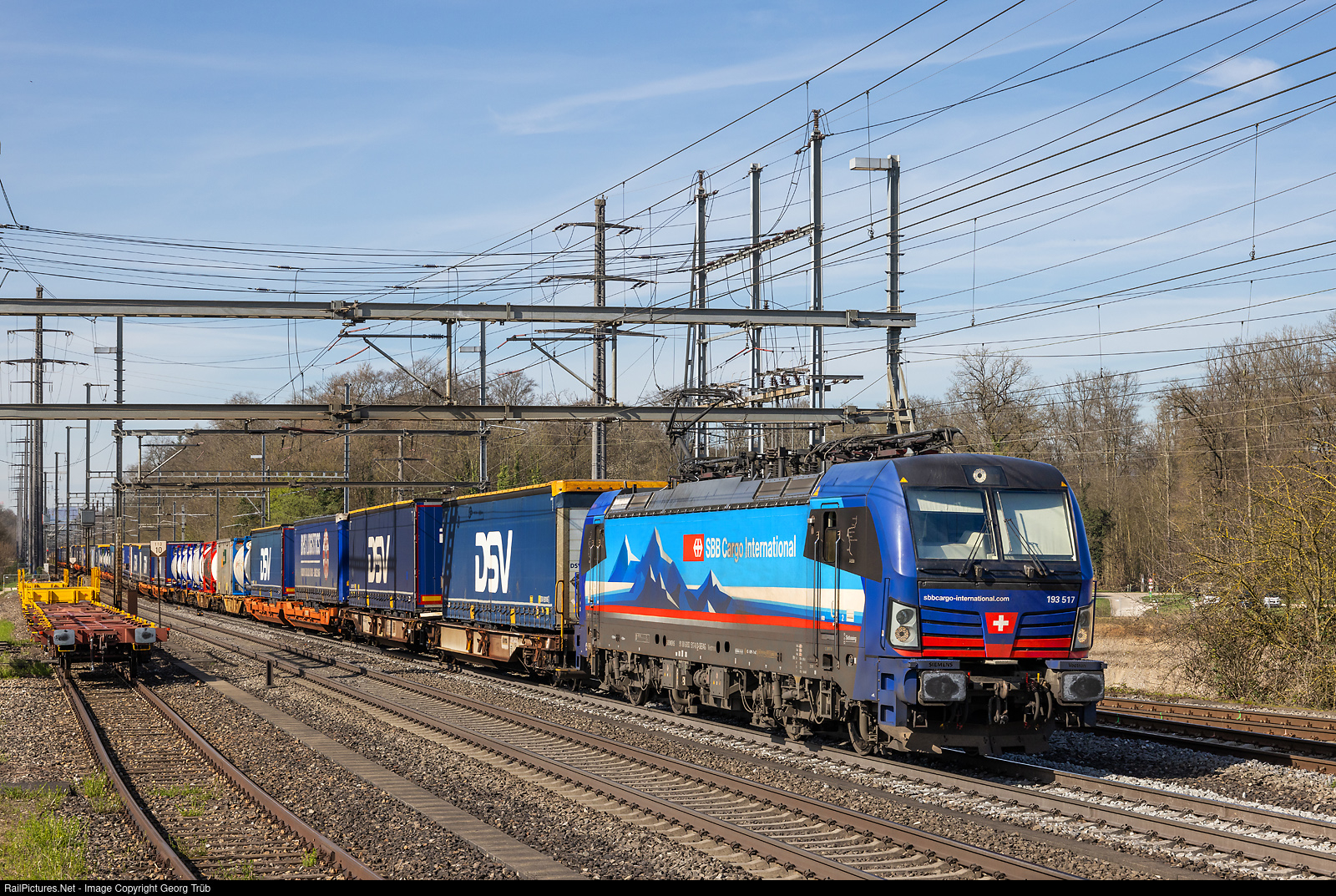 Siemens "Vectron" 193 # 517 "Adda" of SBB Cargo International, rented from the SüdLeasing, pulls the HUPAC intermodal train 40003 from Paris Bonneuil-sur-Marne/France via Basel-Bözberg-Gotthard Base Tunnel-Luino to Novara/Italy, with connections further to Pescara and Bari, through Möhlin.