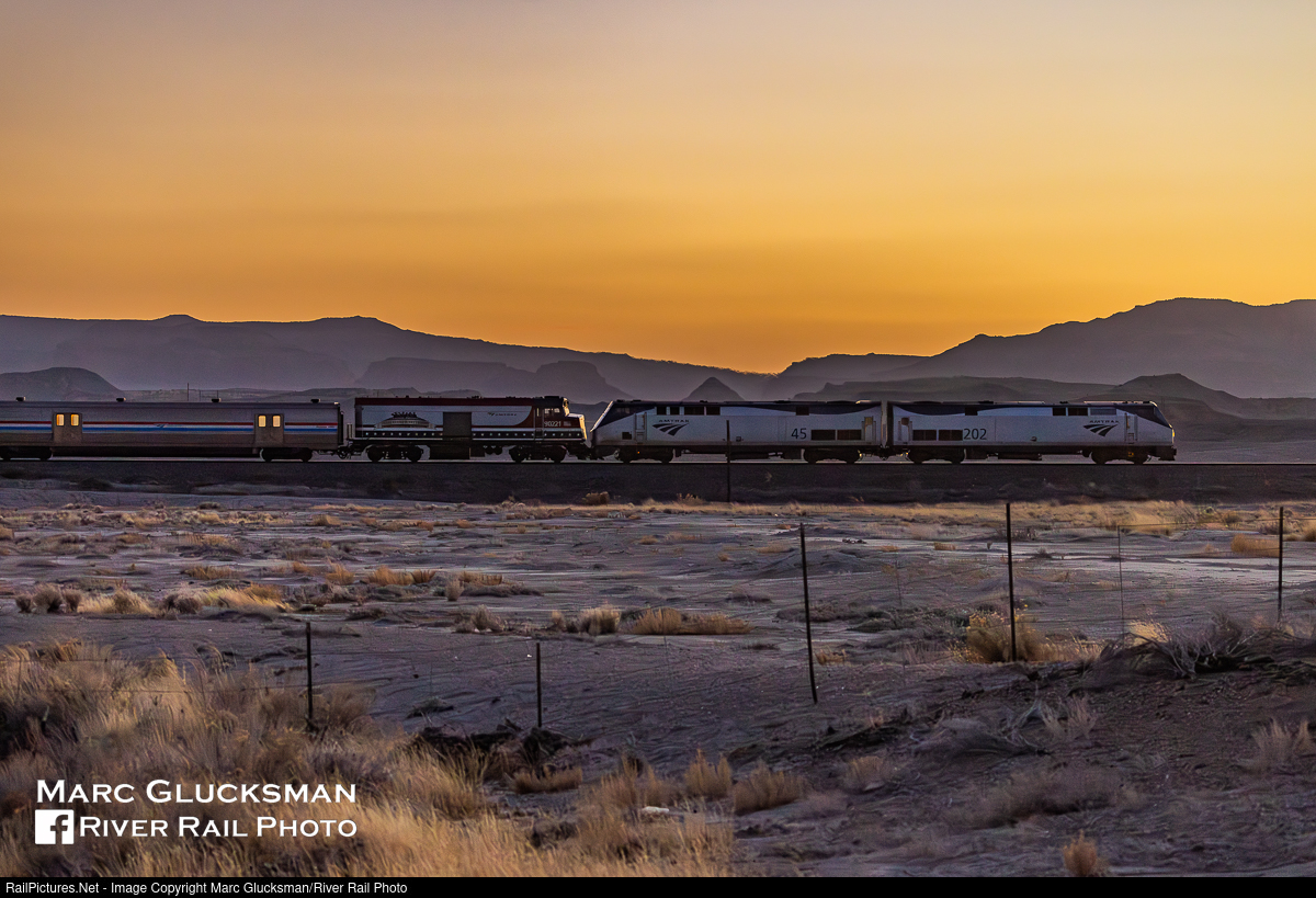 Sunset Zephyr. It was late in the evening of March 24, 2022 when the Amtrak California Zephyr (Train 5) was passing through Woodside, Utah after sunset. An unusual addition to the train, AMTK 90221 (F40NPCU, Salutes Out Veterans, formerly AMTK 221, F40PH) is 3rd out, behind P42DCs 202 and 45. NPCU means "Non Powered Cab Unit", as this former engine now only functions as a cab control car. It was with the consist from Chicago, Ilinois to Emeryville, California. Last week the California Zephyr celebrated the 75th Anniversary of its first run, having commenced service on March 20, 1949 by the Chicago, Burlington & Quincy (CB&Q), Denver & Rio Grande Western (D&RGW) and Western Pacific (WP) Railroads. After various changes over the decades, on July 16, 1983 Amtrak restored the name California Zephyr to the service.