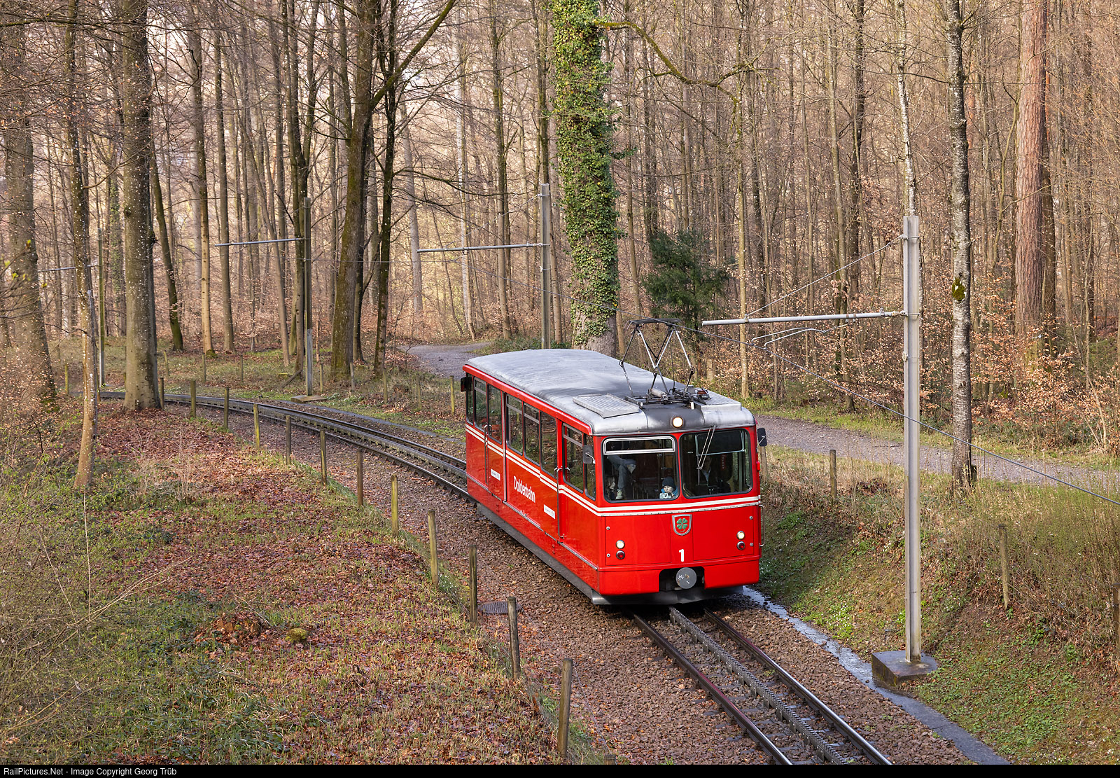 Cogwheel railcar Bhe 1/2 # 1 of the Dolderbahn in Zürich. The vehicle was built in 1973 by SLM and BBC and will be withdrawn in summer 2024, replaced by a new one built by Stadler. The 1 meter gauge cogwheel railway is 1,328 kilomter long with von Roll cogwheel system and goes from the Römerhof to the Dolder mountain station in Zürich. The railway has two railcars which run in a 10 minutes timetable. In the moment, railcar # 2 was brought away already, and # 1 is running every 15 minutes. From summer this year, the two new railcars Bhe 1/2 # 1 and # 2 from StadlerRail will be operating.