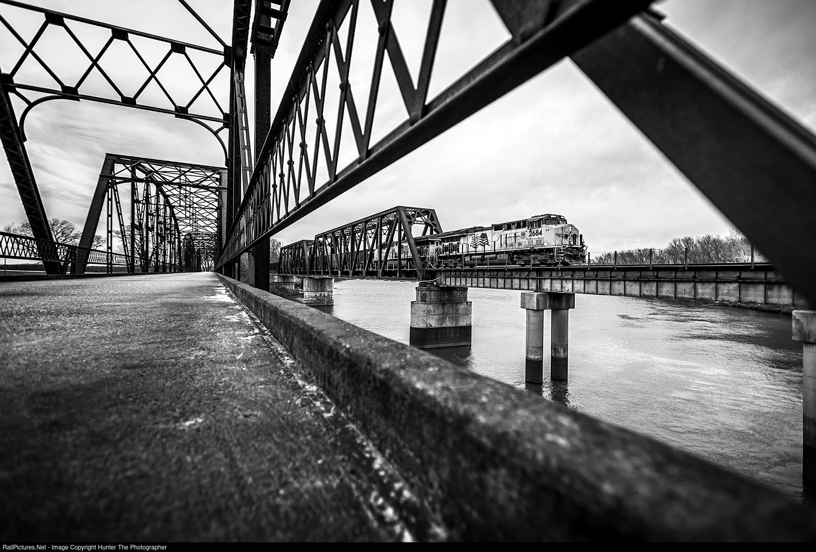 Iron, Steel, and Coal | On an overcast Sunday, March 24, 2024 morning, a southbound Union Pacific train of coal loads crosses the Neosho River at Fort Gibson, OK. The former Missouri Pacific rail bridge parallels the old highway bridge which is now open to pedestrians and bicycles only. Both spans were constructed in the mid-1920s.