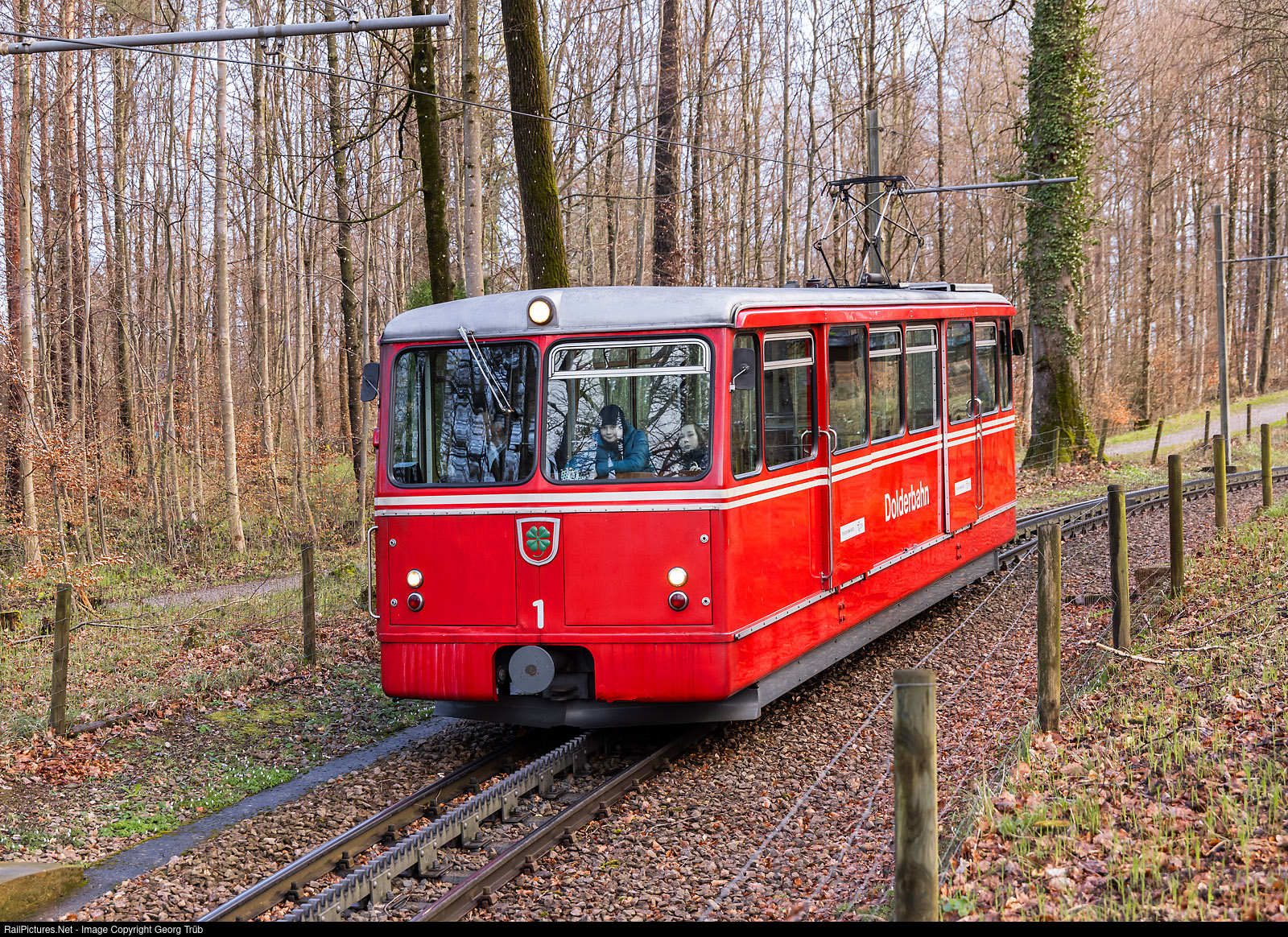 Cogwheel railcar Bhe 1/2 # 1 of the Dolderbahn in Zürich is running down through the forest between Bergstation (mountain station) and Waldhaus Dolder stop. The vehicle was built in 1973 by SLM and BBC and will be withdrawn in summer 2024, replaced by a new one built by Stadler. The 1 meter gauge cogwheel railway is 1,328 kilomter long with von Roll cogwheel system and goes from the Römerhof to the Dolder mountain station.