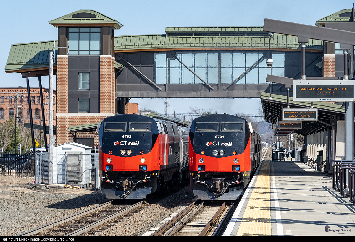 At exactly noon time on March 13th, 2024, southbound CTrail Hartford Line train 4403, led by CTrail (CTDX) GE P40BH 6702, meets northbound CTrail Train 4406 (pushed by GE P40BH 6701) at Wallingford Station on the MRS (Hartford) Line.