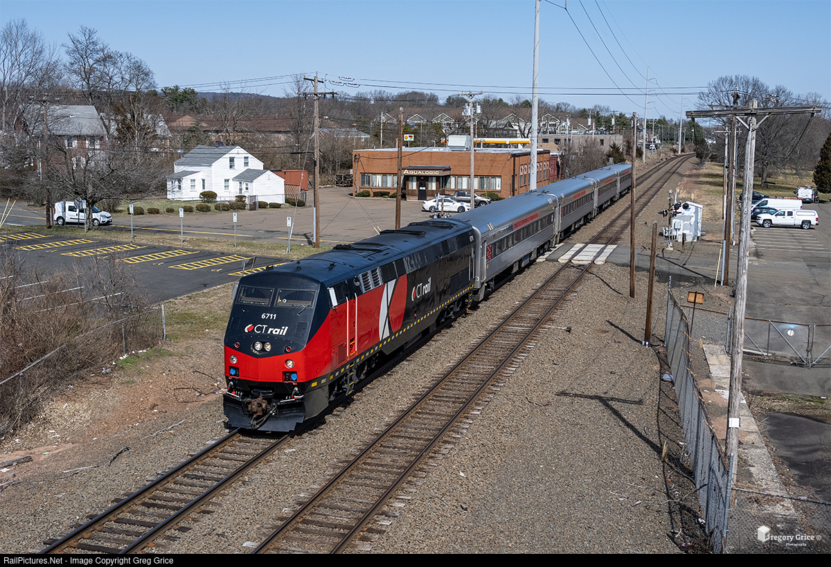 On the afternoon of March 13th, 2024, southbound CTrail Hartford Line train 4405, led by CTrail (CTDX) GE P40BH 6711, crosses Devine Street on the MRS (Hartford) Line in North Haven, Connecticut as seen from above on the Mount Carmel Connector (CT-Route 40).