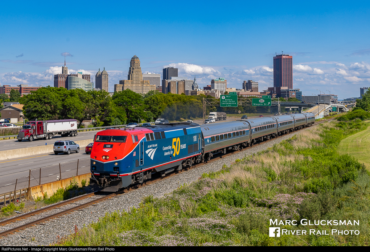 Buffalo Summer. Amtrak Train 63 makes a nice appearance next to Interstate 190 with the skyline of Buffalo, New York in the background on the sunny early afternoon of June 29, 2022. Amtrak 108 (P42DC, Phase VI, 50th Anniversary) makes for a colorful leader as the train heads towards Niagara Falls, New York before crossing the border and ending its day in Toronto, Ontario, Canada. While there are some new buildings in the photo that have been constructed in recent years, downtown Buffalo has had a number of tall buildings for decades. This locomotive was one of six locomotives painted or wrapped in a special paint scheme for the 50th Anniversary of Amtrak in 2021. While it can run anywhere in the Unites States and Canada that Amtrak operates, it is usually found in the northeast US as it is equipped with all of the necessary PTC related equipment.