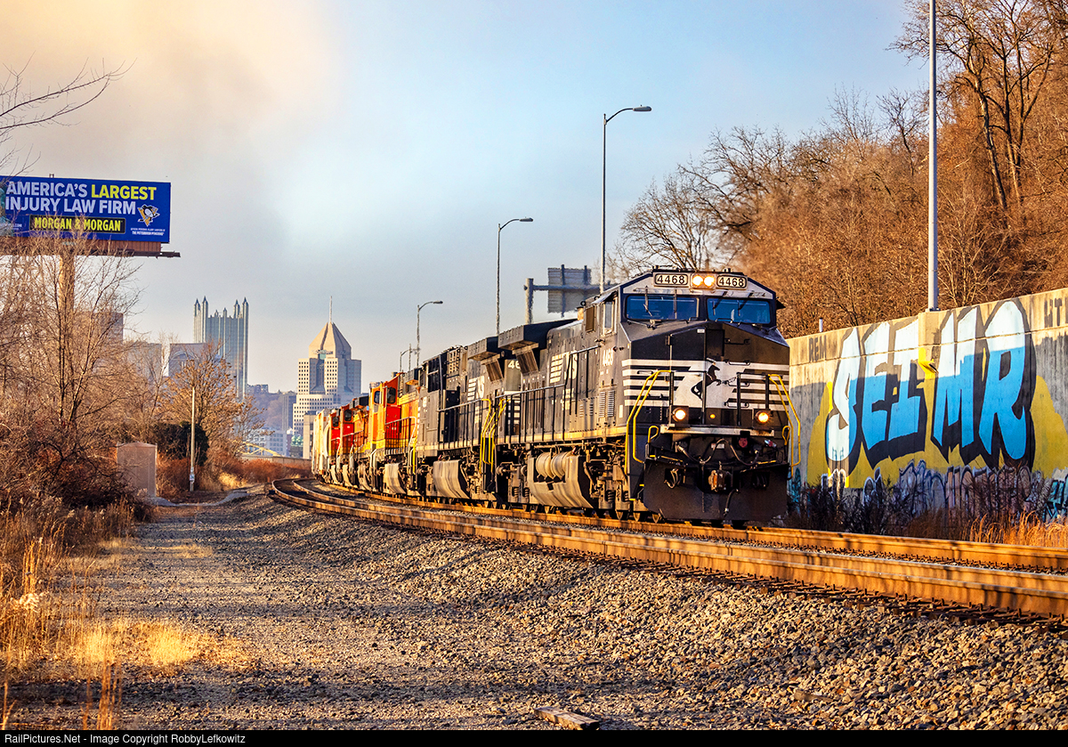 NS 4468 leads manifest 10G eastbound onto the Conemaugh line, as it passes through CP Penn. Pittsburgh's skyline can be seen in the distance. |