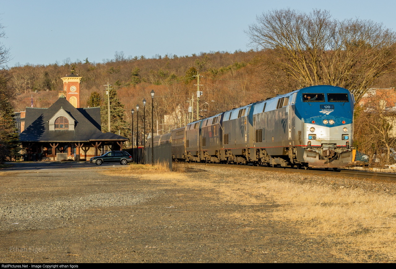 | P449 heads west thru Chatham, as the engineer gives me a thumbs down for my Boston Red Sox gear lol; The Amtrak 100 trailed 3 of 4 on this train. |
