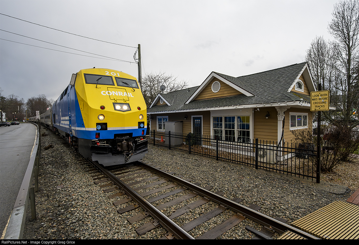 Metro-North's 40th Anniversary "Conrail" heritage-wrapped P32AC-DM, MNCW 201, leads train 943 past the former Pawling, New York station house as it heads up the upper Harlem Line on March 20th, 2024.