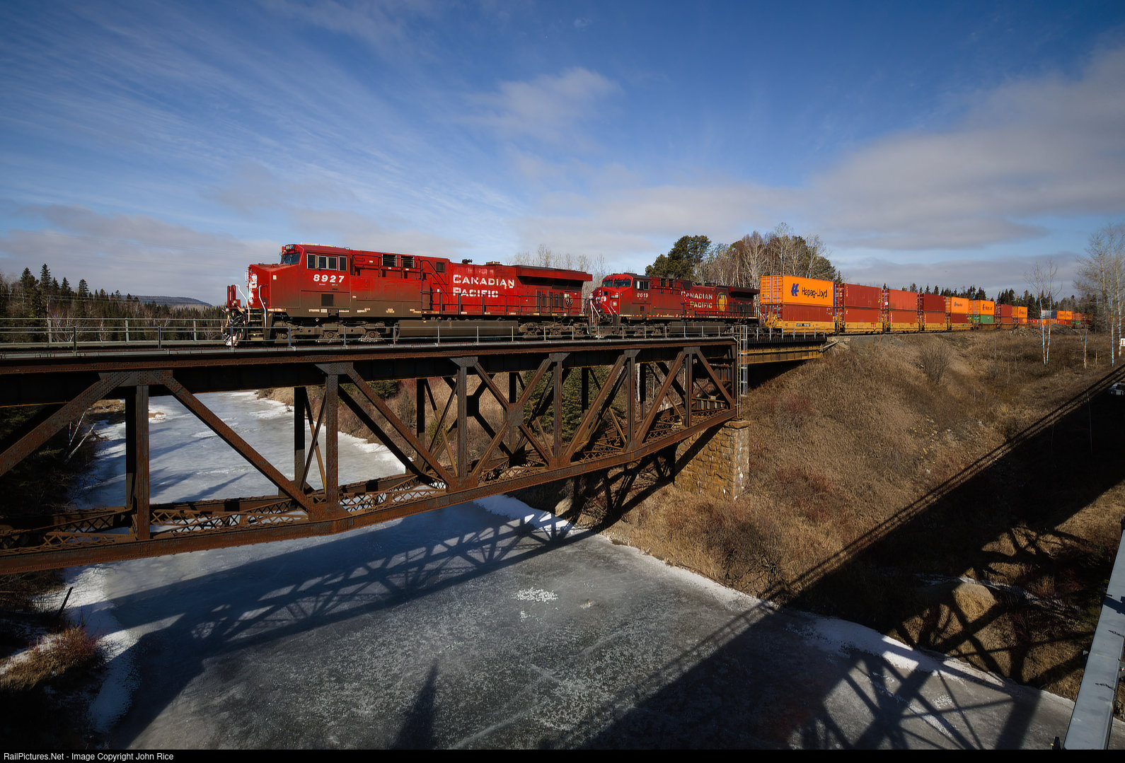 CP 8927 leads CPKC train 113 accross the Black Sturgeon River near Nipigon, Ontario.
