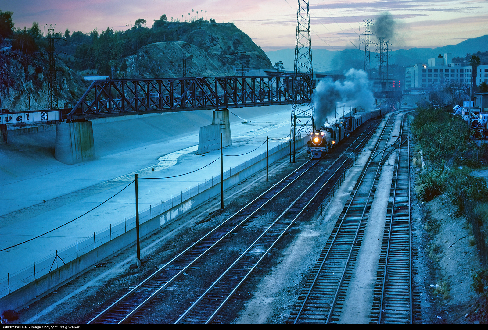 As the British Columbia display train nears its destination, Los Angeles Union Passenger Terminal, BC 4-6-4 2860 has not gotten onto Union Pacific's Los Angeles Sub, on which Southern Pacific has trackage rights. And, thanks to the peculiarity of SP's directions – anything heading away from San Francisco is eastbound – this train is now technically westbound because that's how UP does things … Apparently, UP uses a compass! The train is nearing UP's Pasadena Junction on the Los Angeles River's east bank, and the "Royal Hudson" and its train have just passed under the Santa Fe's Second District, which heads to Pasadena as well. The train is now less than five miles from the end of its journey from British Columbia. (Los Angeles, California – March 29, 1977)