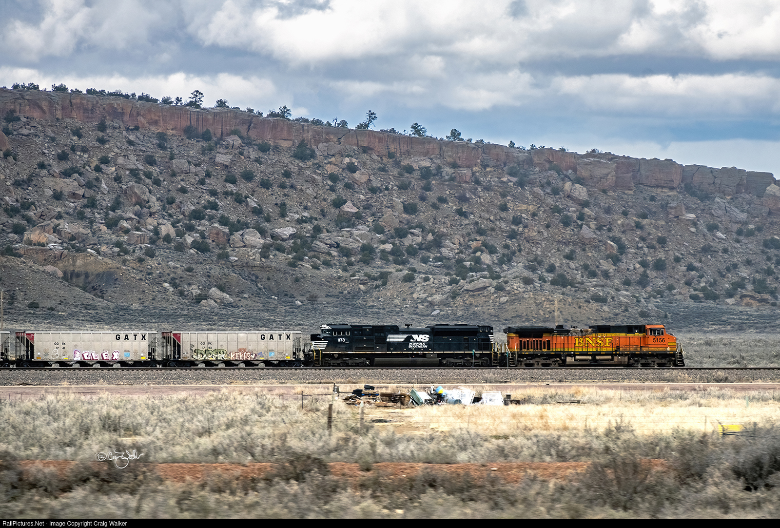 | On the outskirts of Gallup NM is an eastbound BNSF Railway freight led by BNSF Dash 9-44CW 5156 and Norfolk Southern SD70ACe 1173. (Mentmore, New Mexico – March 19, 2024) |