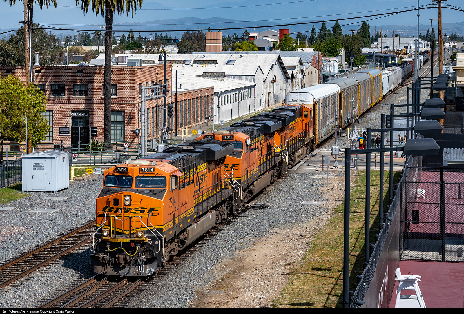 A somewhat rare daylight move of a San Diego-bound freight, BNSF H-BARSDG1-25A, occurred when the train transitioned off Metrolink’s Olive Sub and onto Metrolink’s Orange Sub at 11:00 am, as Amtrak Pacific Surfliner 770 (Goleta CA to San Diego CA), with CDTX SC-44 2118 for power, rounds the curve at the junction (CP Olive) in the distance. Chapman University students are being held up on their way to the school's Crean Hall. The freight originated in Barstow and is led by ES44DCs 7814 and 7317, with ES44C4 8255 and, on the rear, BNSF Dash 9-44CW 4324 and ES44C4 8217. Clearly there are no northbound trains at this hour! (Orange, California – March 27, 2024)