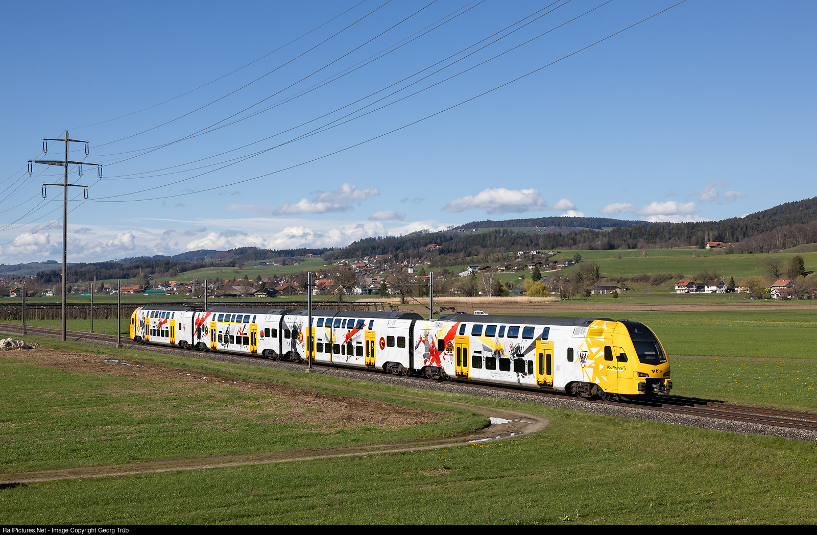 | "Icehockey train" RABe 515 # 008 of the BLS is running train 15158 of the line S1 from Thun via Bern to Fribourg, between Kiesen and Wichtrach. |