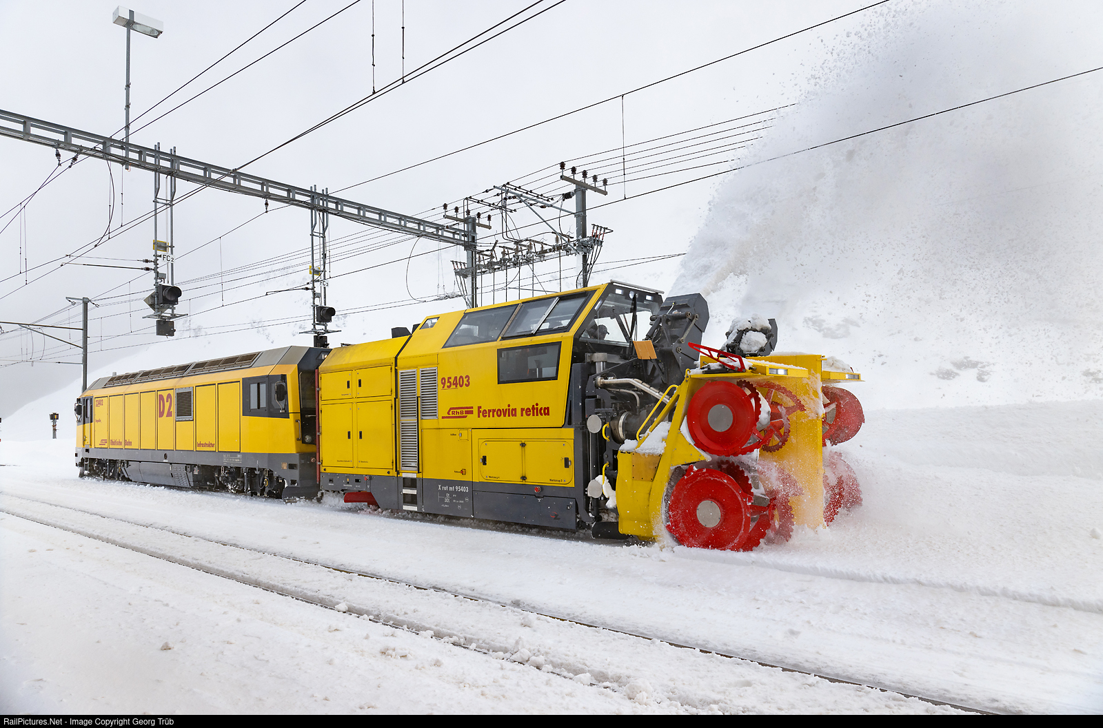 | On this day, the Rhaetian Railway snowplow crew from Poschaivo was only called out at midday because the light snowfall combined with a heavy storm from the south at the pass threatened the free movement of the trains. At 3.49 PM in the afternoon, the snow blower Xrot mt # 95403 pushed by the diesel locomotive Gmf 234 # 02 "Engadin" clears track 2 in Ospizio Bernina for the later crossing of trains 1660 and PE 955. The snow has turned slightly yellowish because a large amount of dust from the Sahara desert in Africa has been blown against the Alps.