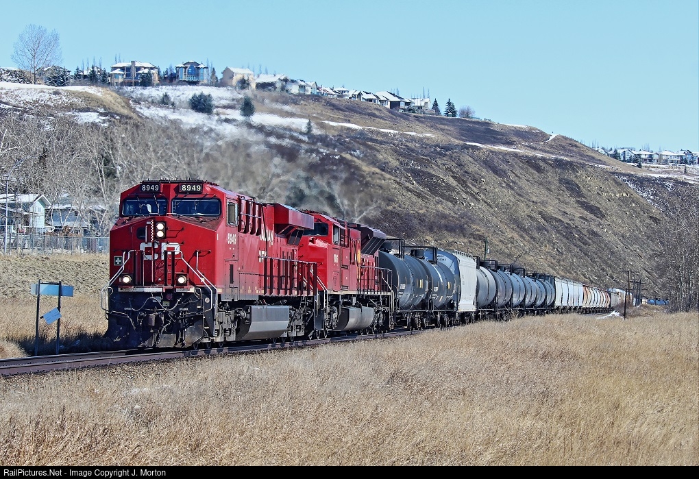 | CP 8949 leads a mixed manifest train west through Cochrane, AB. It snowed a bit overnight but, most of it melted by the afternoon. |