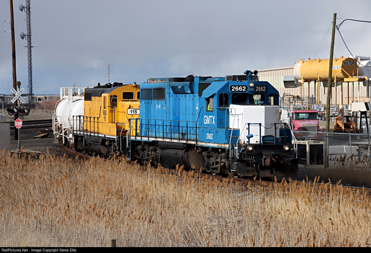| GMTX 2662 and RSSX 116 carefully shove a large string of tank car's, around the corner, up into Garfield yard. |
