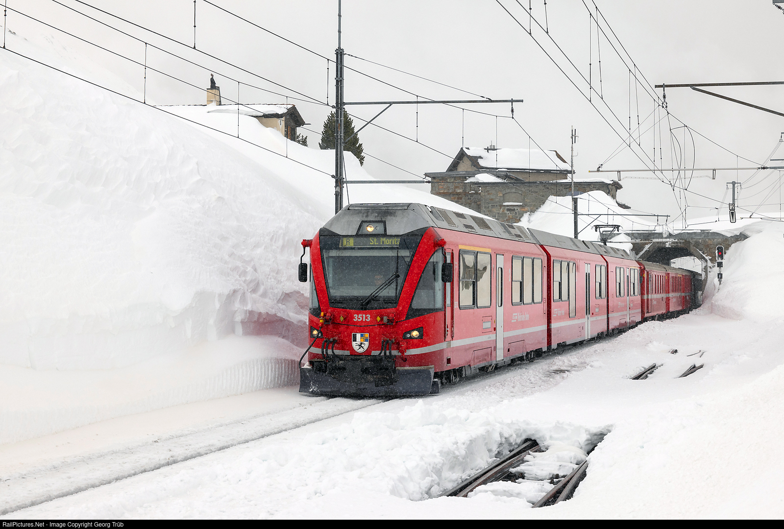 | This winter, the amount of snow on the Bernina Pass is far above average. The Rhaetian Railway line is the highest Alpine crossing that does not run through a tunnel. Here at Ospizio Bernina, the trains reach an altitude of 2253 meters above sea level. Train 1656 from Tirano to St. Moritz, with the "Allegra" ABe 8/12 # 3513 arrives at Ospizio Bernina. Two heated points can be seen in the foreground. Track 2 was only cleared a little later that day by the snow blower from Poschiavo for the crossing of regional train 1660 with PE 952 BERNINA EXPRESS Chur-Tirano.