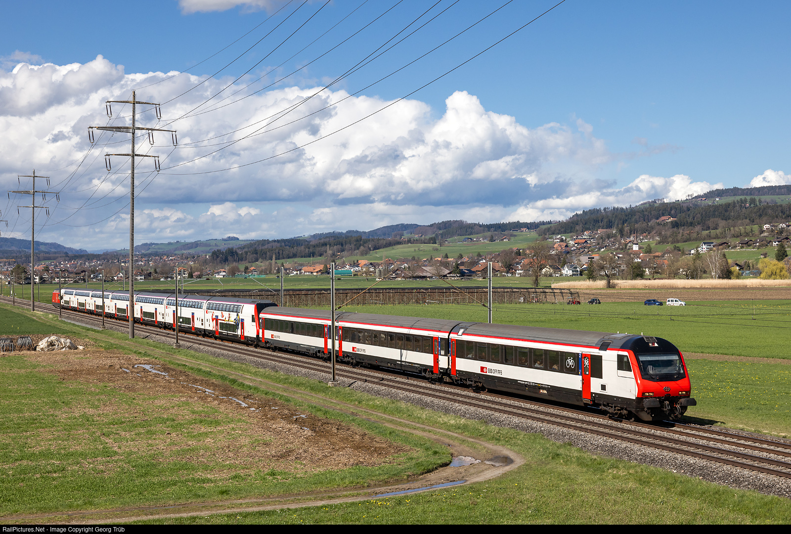 | Doubledeck push-pull train of the SBB, with Re 460 # 070 shoving in the rear and 7 "IC2020" cars, in front reinforced with cab car Bt and two revised second class standard cars type IV, running at 160 km/h on the Aaretal main line between Wichtrach and Kiesen. The IC 1073 is on the way from Basel via Olten-Bern-Thun to Interlaken Ost. |