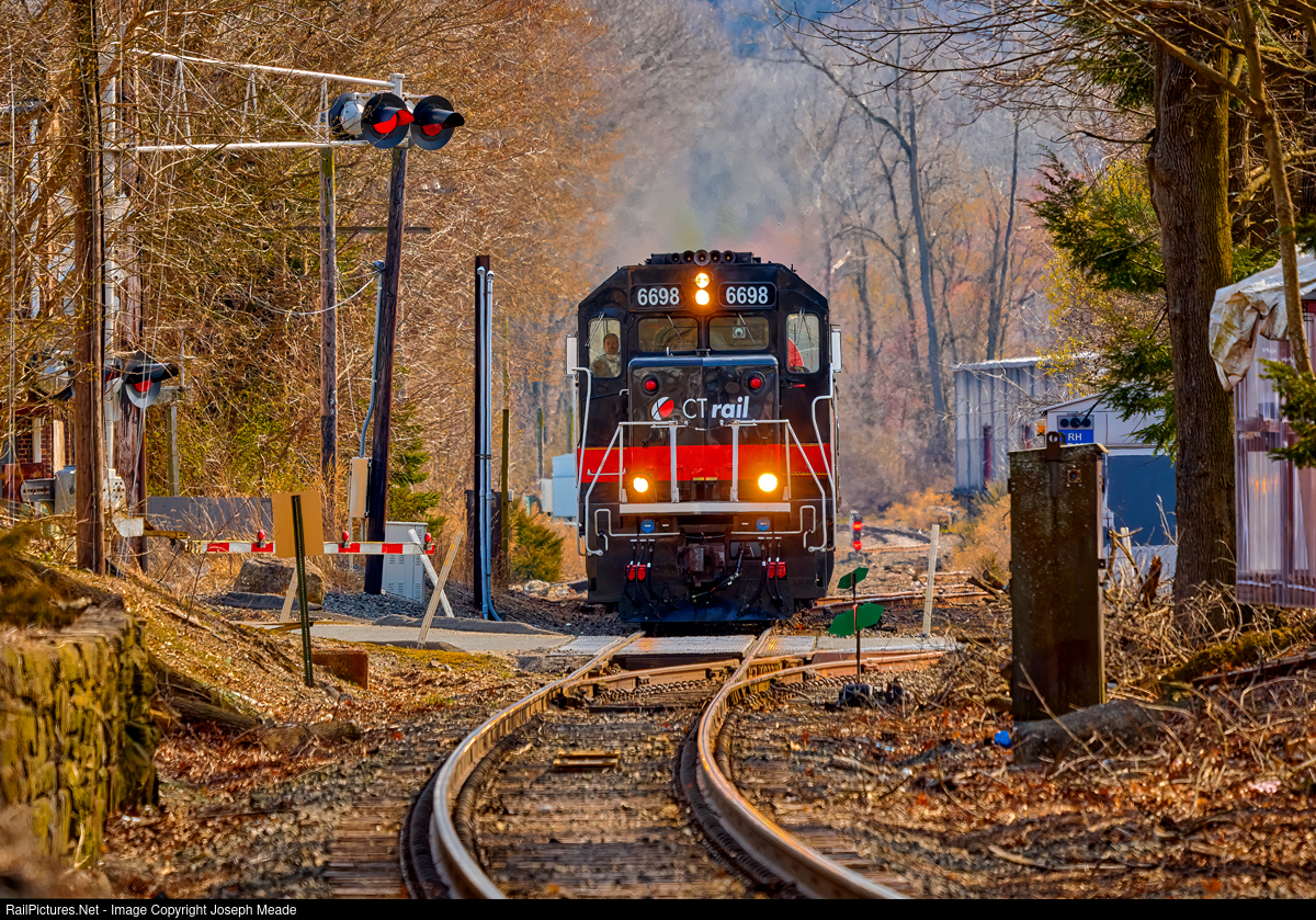 | Metro-North train 6834 led by CDOT/CT Rail 6698 GP40-3H clears CP421 approaching Taylor St in Bethel enroute to Danbury on a pleasant spring afternoon. The defunct Rings End switch can be seen in the foreground. |