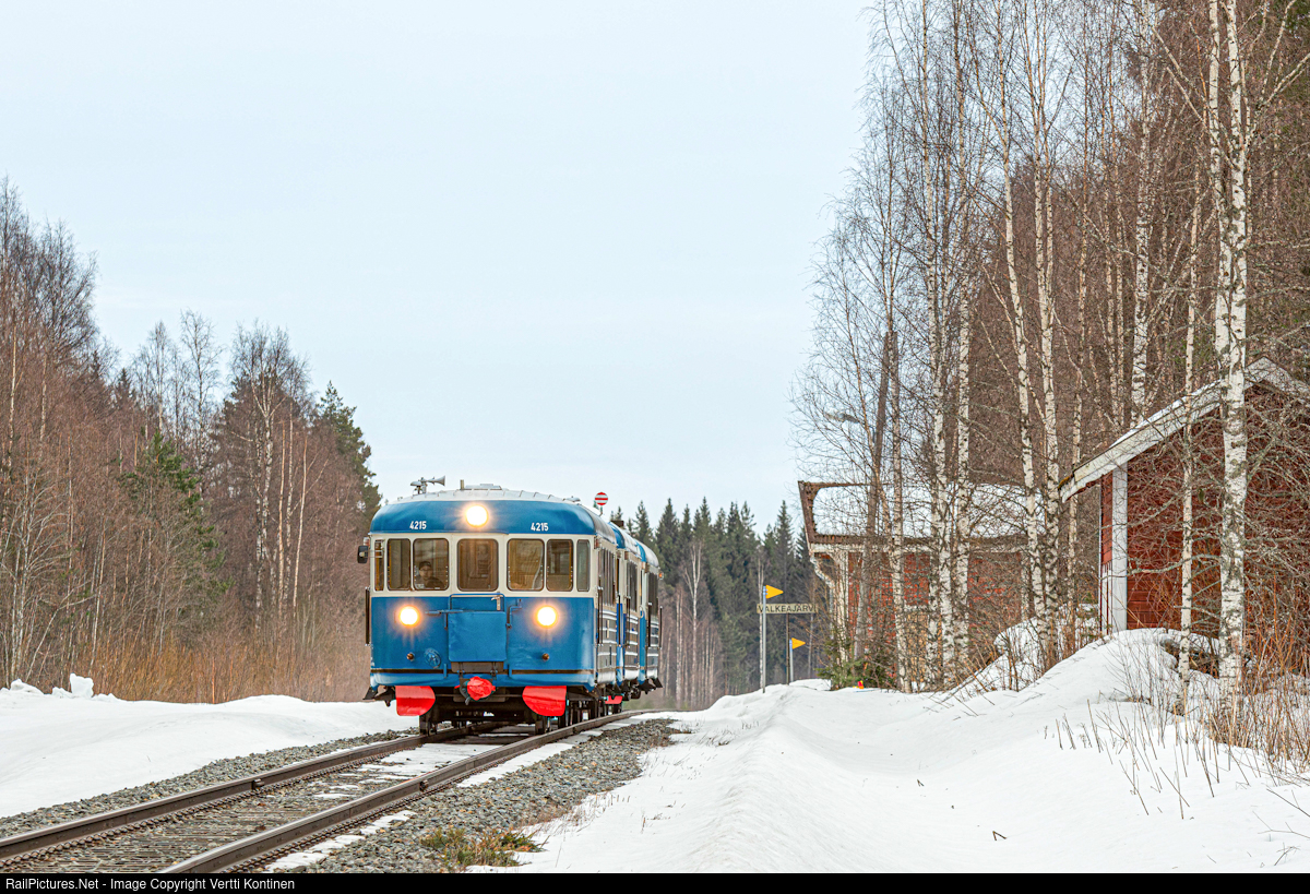 | Haapamäki museum locomotive society Dm7 diesel railcars and type EFiab non powered baggage car on a test drive from Haapamäki to Ähtäri and back. Here the train is seen next to an old station building in Valkeajärvi. Like all the other regular passenger trains here in the last 30 years, no stopping for this one either |