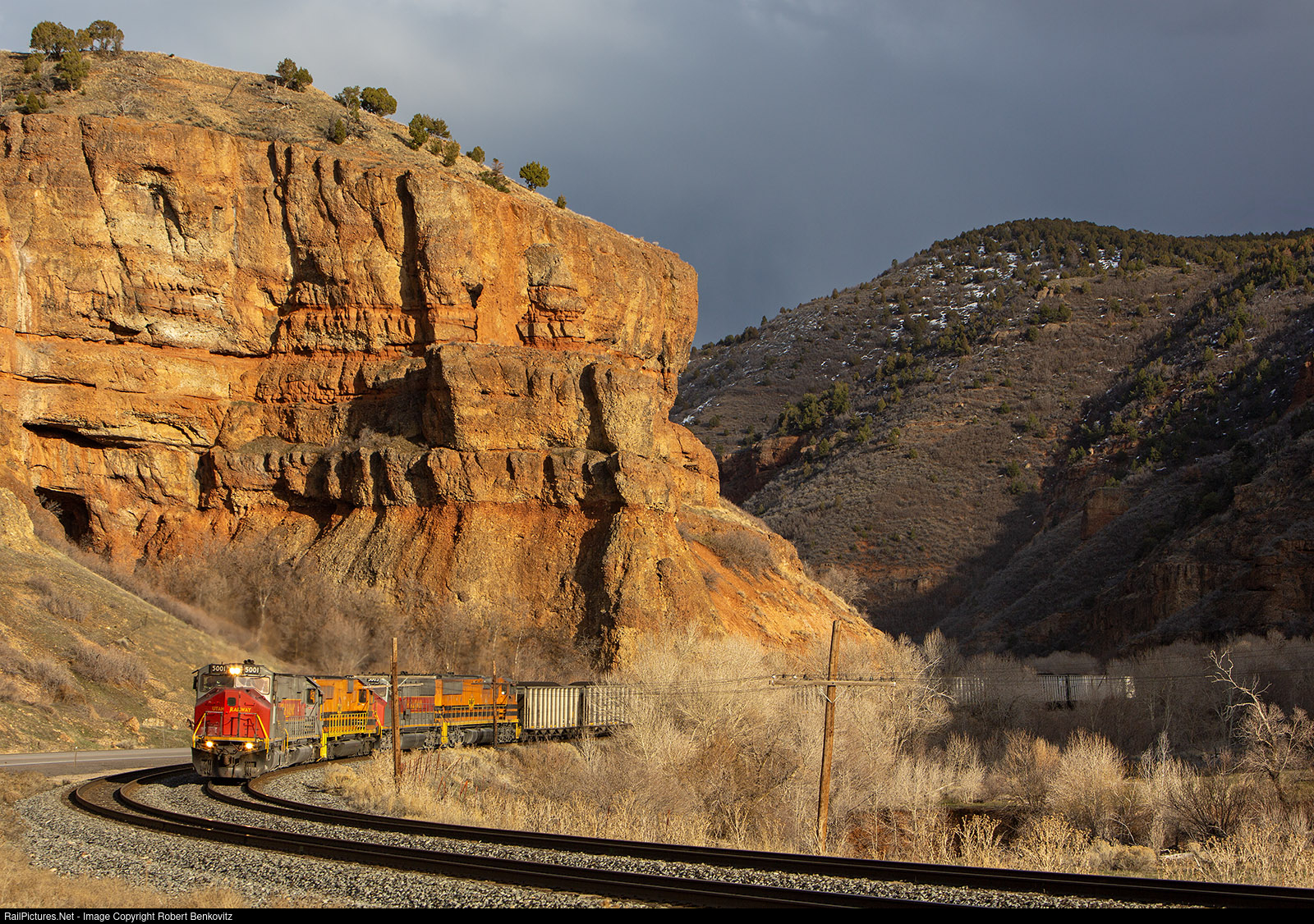 | A loaded Utah coal train, after topping Soldier Summit, is heading downgrade towards Provo. The late afternoon light highlights the magnificent scenery and colorful consist, which includes both the "traditional" URR scheme and the orange and black of corporate owner Genesee and Wyoming. |