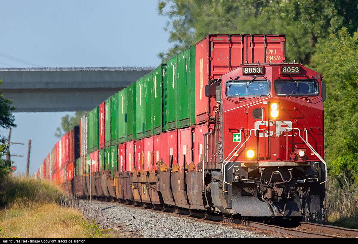 | CP 8053 begins down the hill towards the Trent River which it will soon cross as it makes its way east on this sunny morning. |