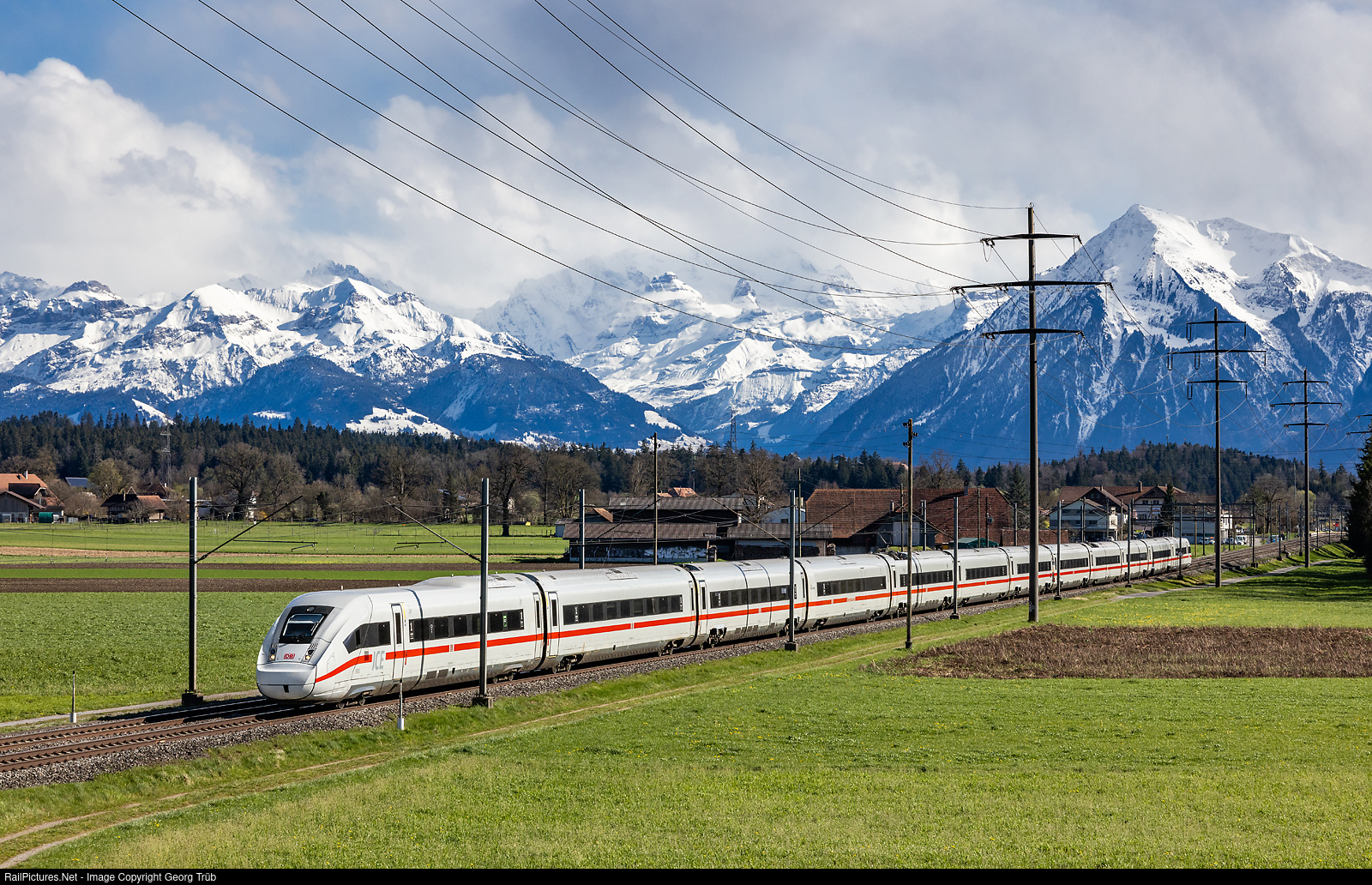 | Highspeed train ICE 4 # 9003 of the Deutsche Bahn is runnng the ICE 376 from Interlaken Ost via Thun-Bern-Basel-Frankfurt to Hamburg Altona, between Kiesen and Wichtrach. |