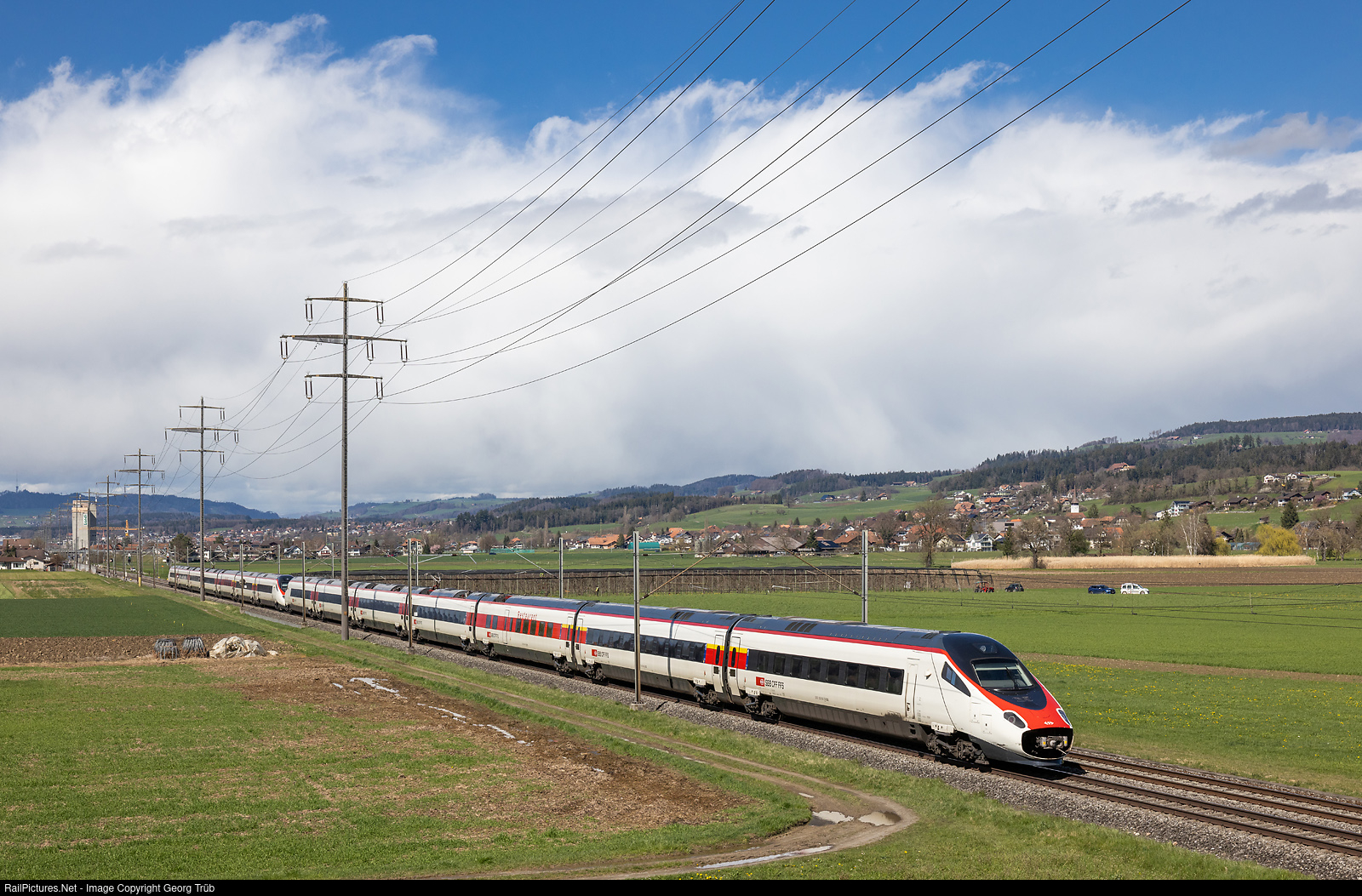 | Highspeed tilting trains RABe 503 # 012 and # 016 of the SBB in multiple control are running the EC 1072 from (Milan-) Brig via Bern to Basel, between Kiesen and Wichtrach. |
