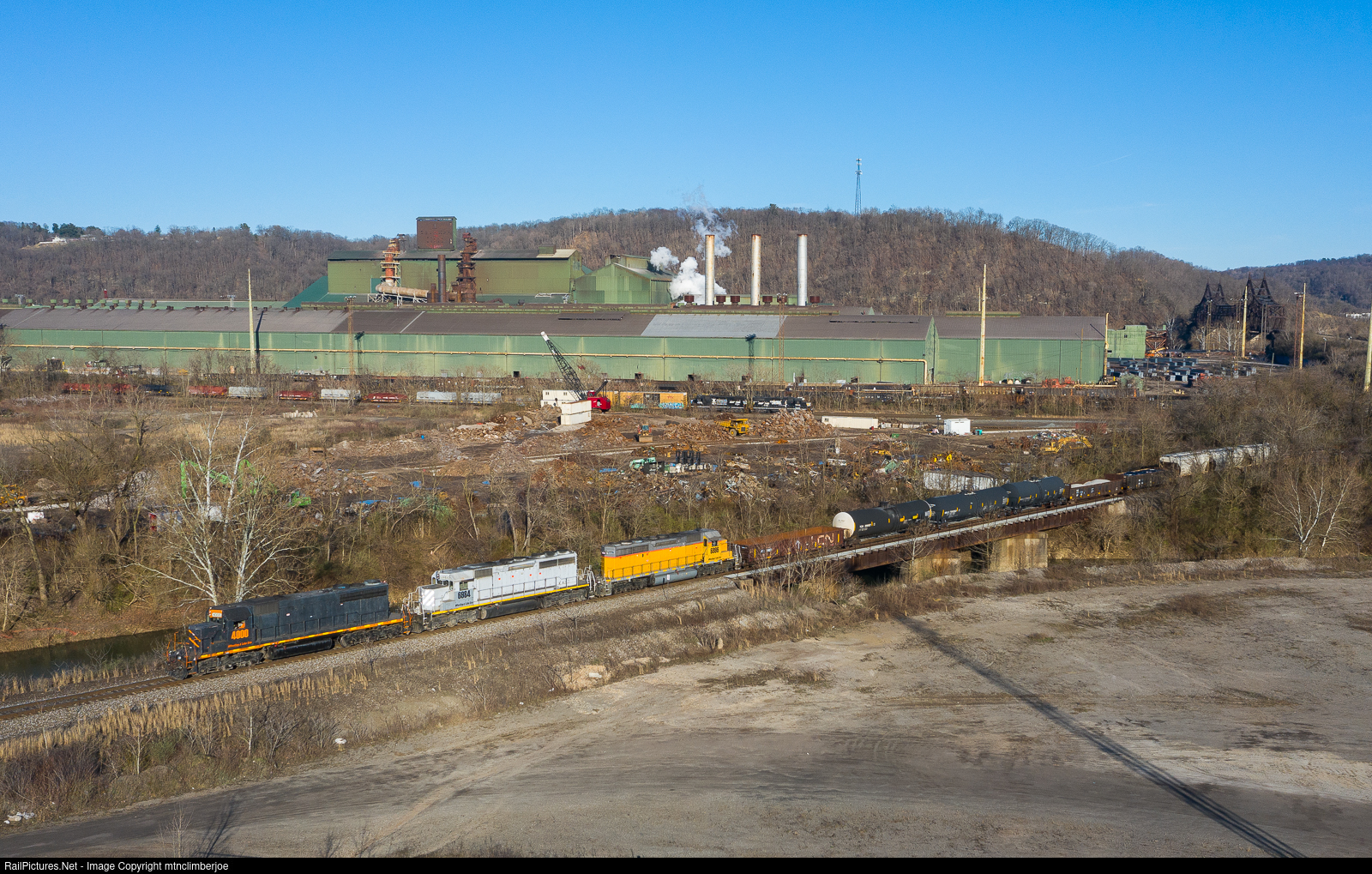 A trio of SD40's lead the Wheeling & Lake Erie train 215 as it departs from the Norfolk Southern yard in Mingo Junction, Ohio, while NS local C17 sits in the background waiting to enter the yard. Due to trackwork on the connection between NS and the WLE, 215 is actually on the Ohio Central's CUOH Pan Subdivision, which it will use to detour between Mingo Junction and Jewett. Once at Jewett, the train will be back on its typical routing, using shared trackage until Bowerston where it will return to home rail.