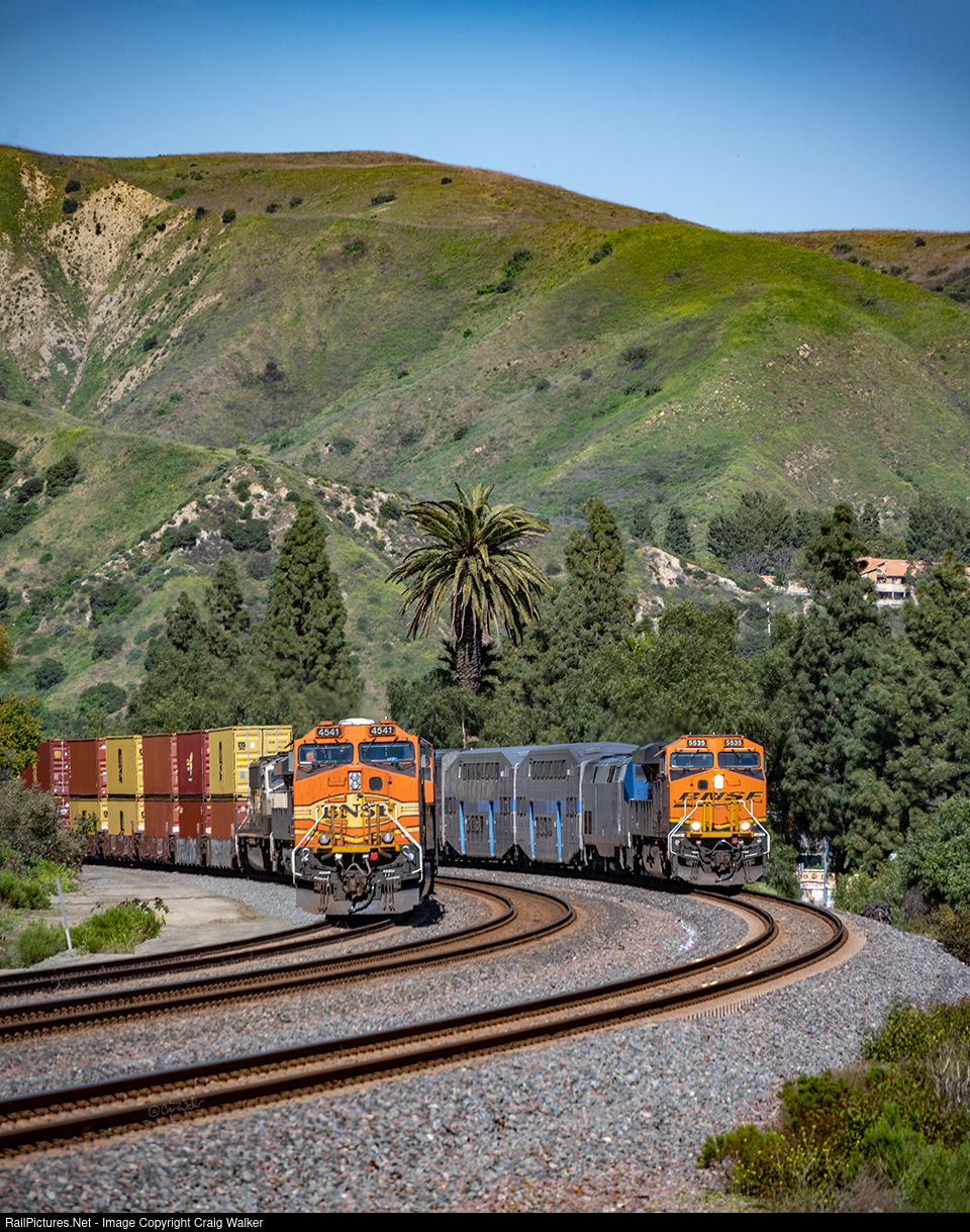(1) On the left is an intermodal train (BNSF S-CDZSCO1-29L) with a Grinstein Green and Cream SD70MAC, not a usual visitor to southern California, as the rear unit, (2) that intermodal train with BNSF Dash 9-44CW 4541 has been sitting here at Esperanza for days, (3) Amtrak train 3, the westbound Southwest Chief, has (yet again) a BNSF freight locomotive on the headend, because Amtrak P42DC 183, which was leading this train (with AMTK 193), crapped out and was removed in Gallup NM, (4) the Chief's first two cars are a pair of Metrolink coaches returning to Los Angeles (from Milwaukee WI, where they were rebuilt) in the carrier's newest paint scheme, (5) the Chief is running, at this point, 8 hours 54 minutes behind schedule, thanks to the bad P42 and also due to a medical emergency en route, and (6) this is southern California, and yet the hills are green! Very unusual! (Yorba Linda, California – April 2, 2024)