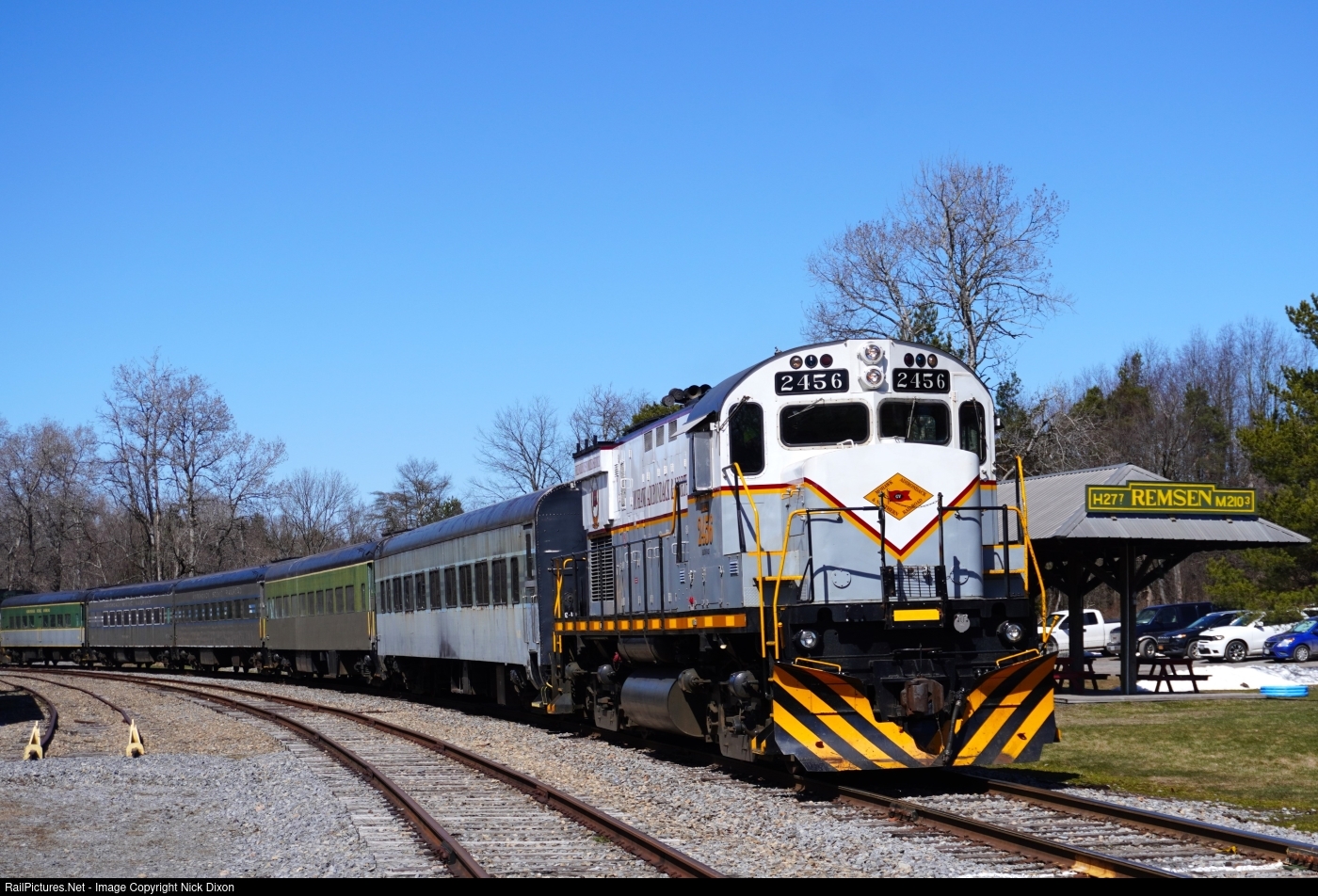 One of Mohawk, Adirondack & Northern's ex-Erie-Lackawanna/BCRail C425s waits at Remsen Depot with a passenger train. The Adirondack Railroad borrowed the 2456 to help run their Holland Patent-Remsen trains in push-pull format for the Easter weekend. The depot, a 1999 recreation of the original Utica & Black River, is marked with mileages to the former endpoints of the NYC Adirondack Division: 210 miles to Montreal, 27 miles to Herkimer.