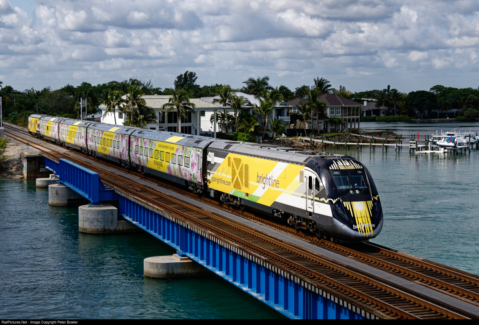 Another of Brightline's colorful 8 different paint schemes crossing over the new replacement Brightline/FEC drawbridge at Jupiter.