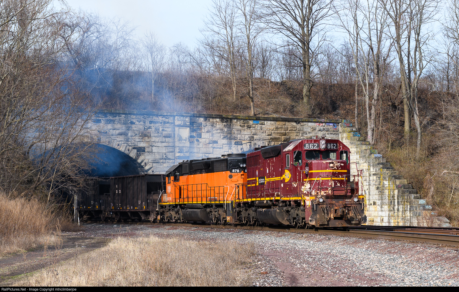 Working as the dock switcher for the yard at the harbor in Conneaut, Ohio, the pair of SD38's smoke it up as they pass through the dual arches that carry both the CN Bessemer Subdivision and Conneaut Creek under CSX's Erie West Subdivision. The L523 is serving as the dock switching crew after they brought 5 ore hoppers up to be returned to service after having air system maintenance completed. After they switch out the ore, stone, and BFT hoppers in the harbor, they will depart south with 9 ore hoppers heading in for their scheduled maintenance.