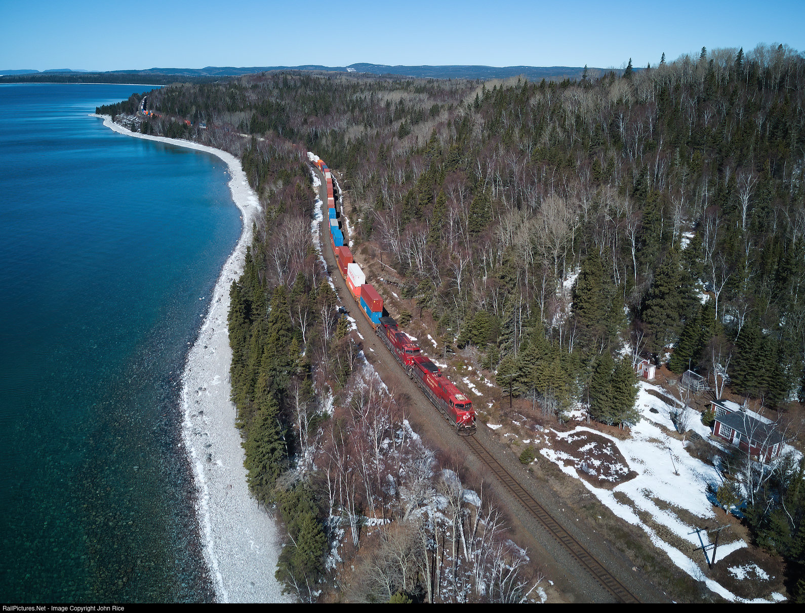 CP train 104 travelling along the shore of Lake Superior between Dublin and Pays Plat on the CPKC Nipigon Subdivision.