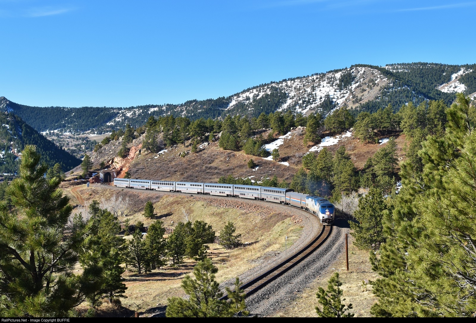 Amtrak engine #205 (P42DC) leads the California Zephyr through Tunnel #1 at Plainview, Colorado.