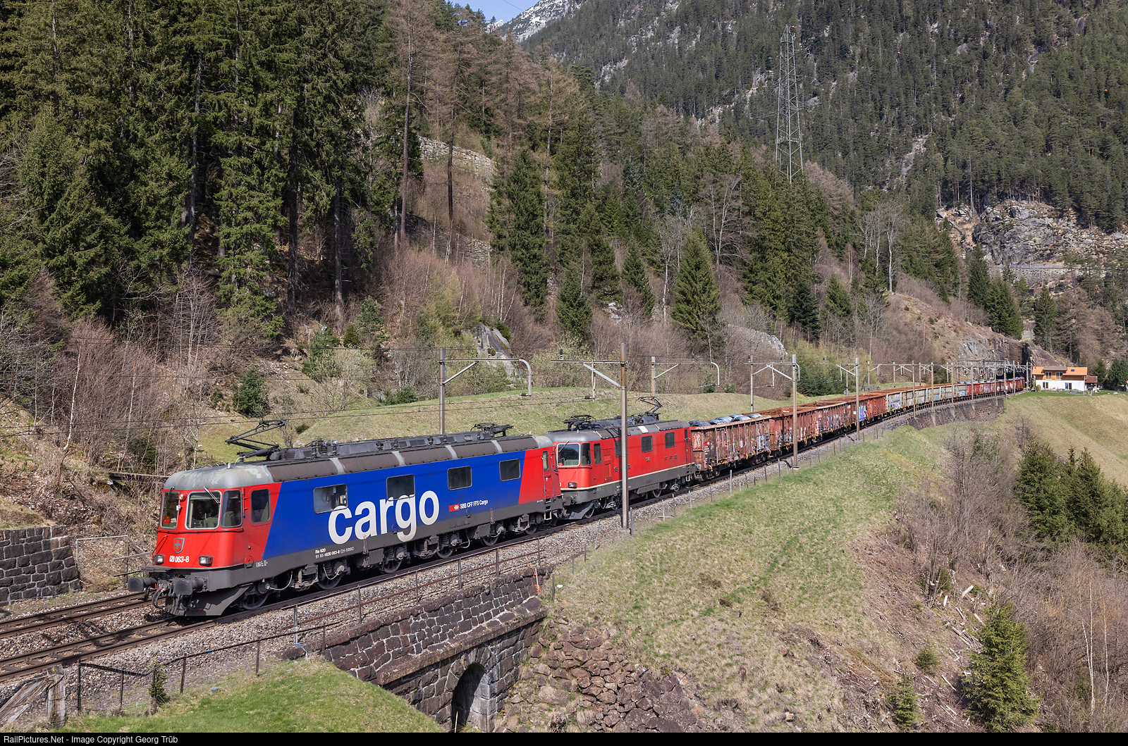 Re 620 # 063 (Re 6/6 # 11663) and Re 420 # 341 (Re 4/4 II # 11341) of the SBB in multiple control, also called a "Re 10/10", pull the steel train 49025 form the Swiss Steel in Emmenbrücke via Lucerne (switchback)-Rotkreuz-Arth Goldau-Erstfeld-Bellinzona-Ceneri Base Tunnel to Chiasso (- Lecco/Italy) with a load of 1394 ton on the Gotthard mountain line between Wassen and Göschenen. This locomotive consist is allowed for the maximum of 1400 ton train load on the 2.6 % grade over the Gotthard.