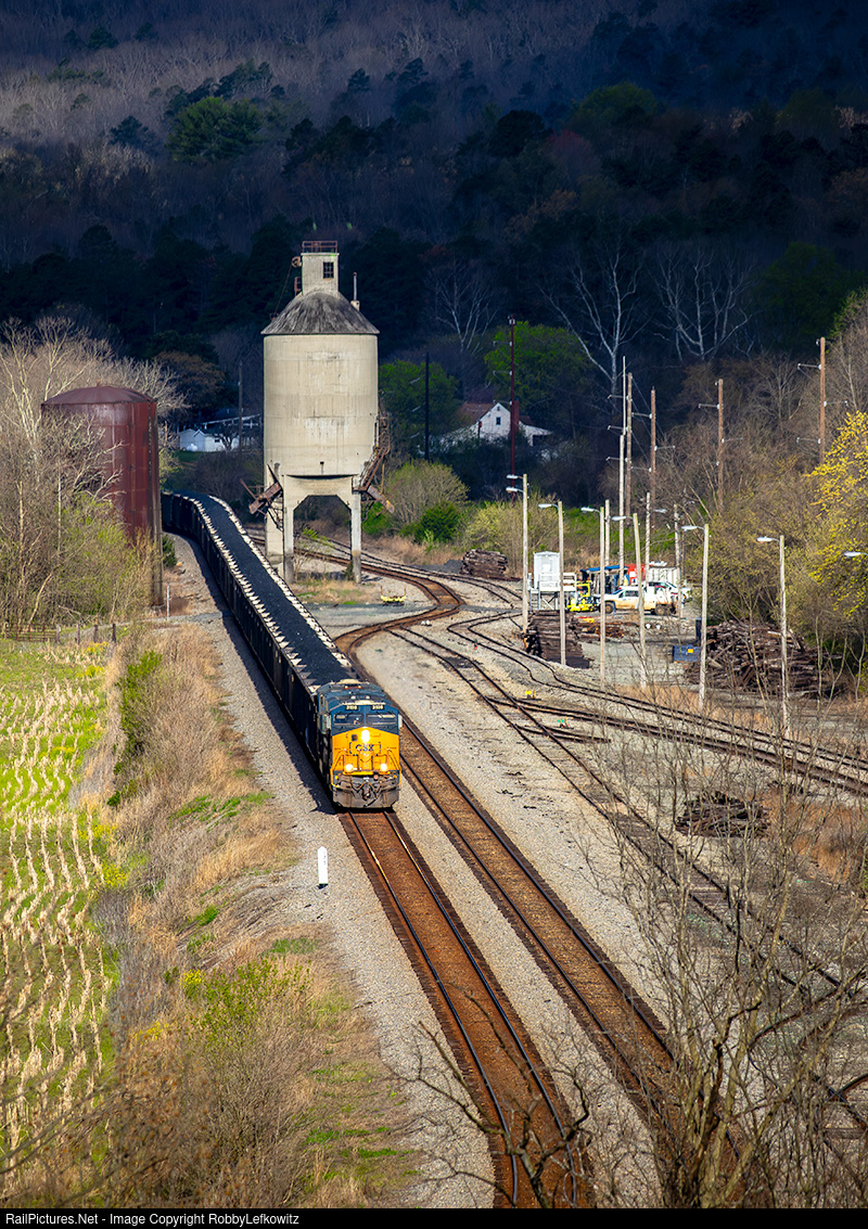 CSXT 3198 leads a doubled up loaded coal train eastbound along the CSX James River Subdivision through Balcony Falls in Glasgow, Virginia, as it passes the old coaling tower and yard. |