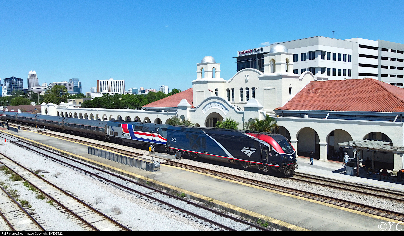 | Amtrak 97 pulls into its Orlando stop with the Dash 8 Phase III heritage unit trailing ALC-42 #332. Over the past couple of months, Siemens' new Charger engines have begun leading Silver Service trains into Florida as the aging Genesis fleet is slowly phased out. The Spanish Mission-style station was built by the Atlantic Coast Line in 1926 and once served as the southern terminus of Amtrak's Sunset Limited. |