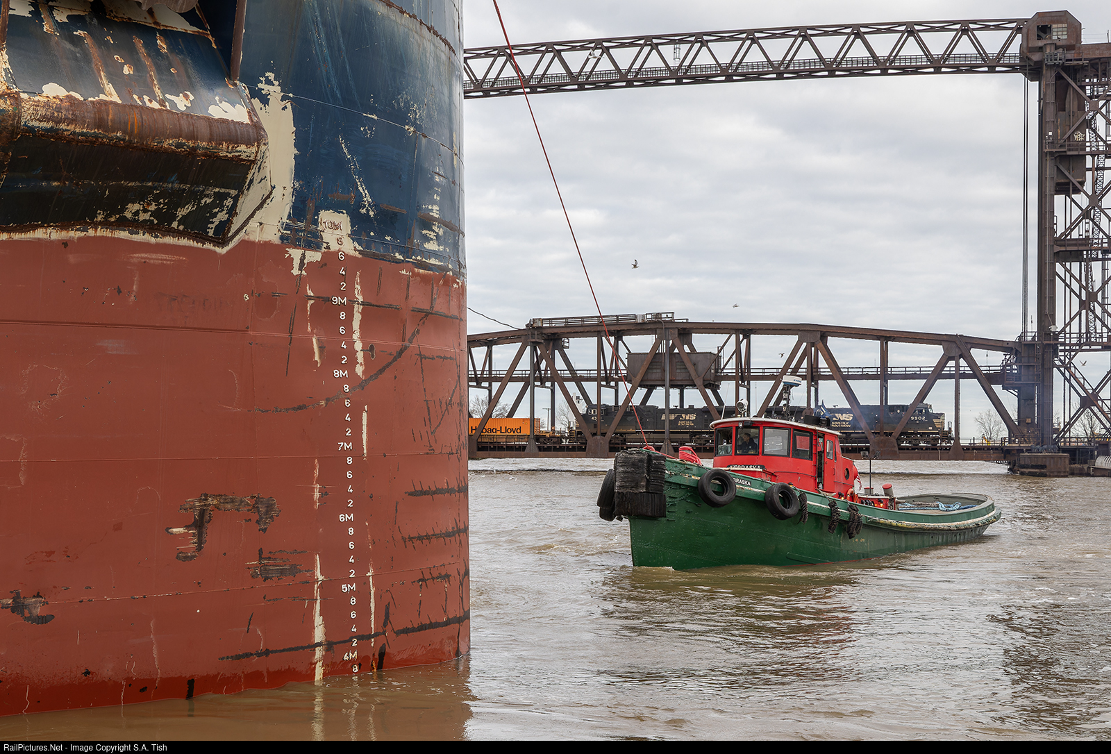 | Where rail meets sail. As the Algoma Innovator is escorted into the Cuyahoga, a Norfolk Southern intermodal train sails over the river |