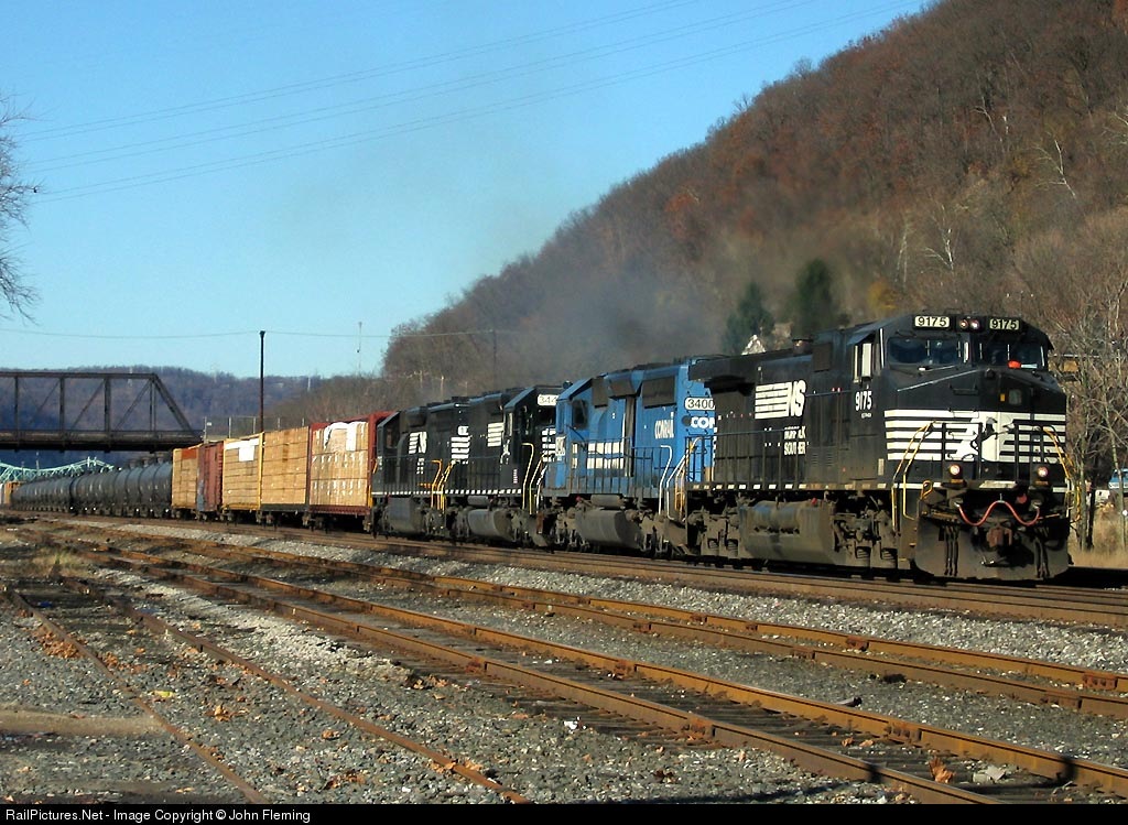 | NS 9175,ex-CR NS 3400, NS 3446, and horsehead SD45-2 NS 1702 lead an eastbound through Leetsdale. |