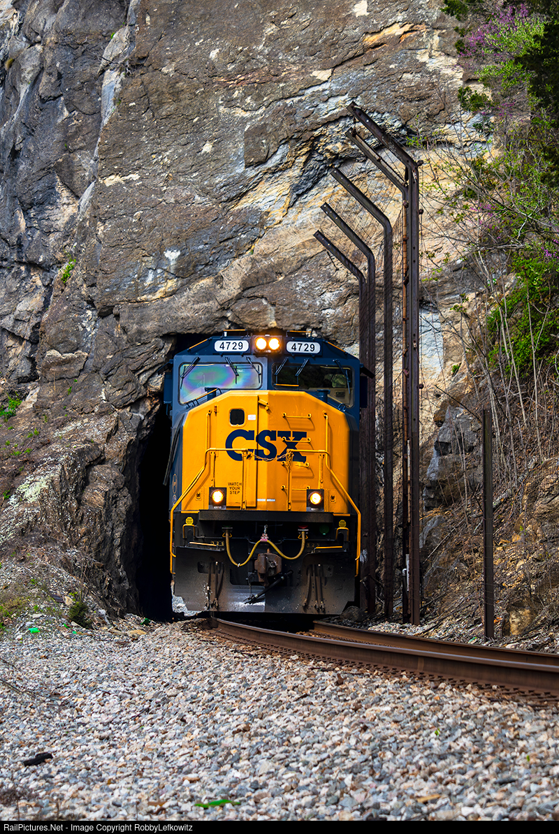 CSXT 4729 leads a loaded Herzog train eastbound out of the Wasp Run Tunnel in Buchanan, Virginia, along the CSX James River Subdivision. |