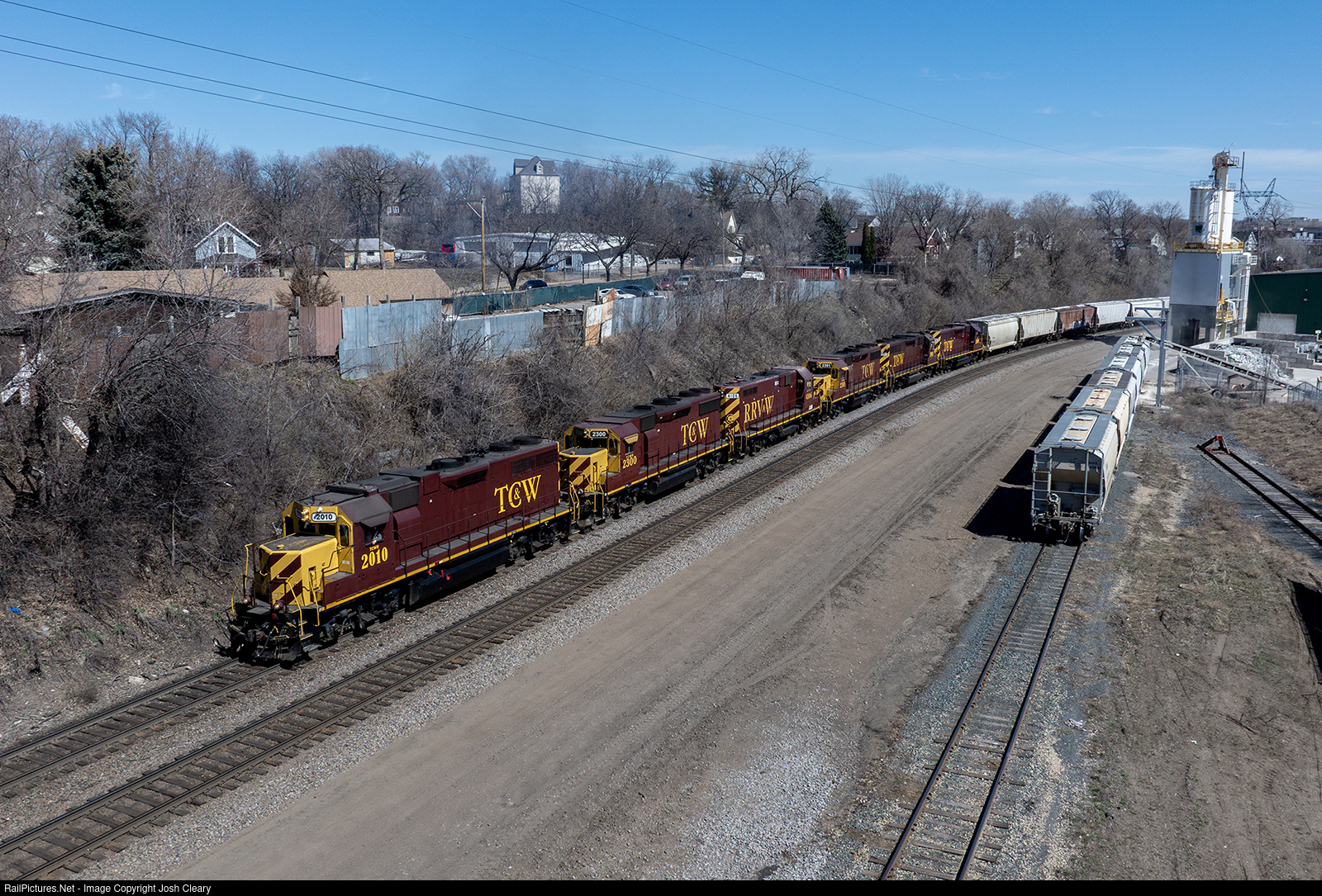 | A sextet of geeps lead the TC&W's St. Paul turn back to Hopkins after interchanging with the UP in South St. Paul. This job typically rates 3-4 locomotives, but they brought over 100 cars down to St. Paul today. |