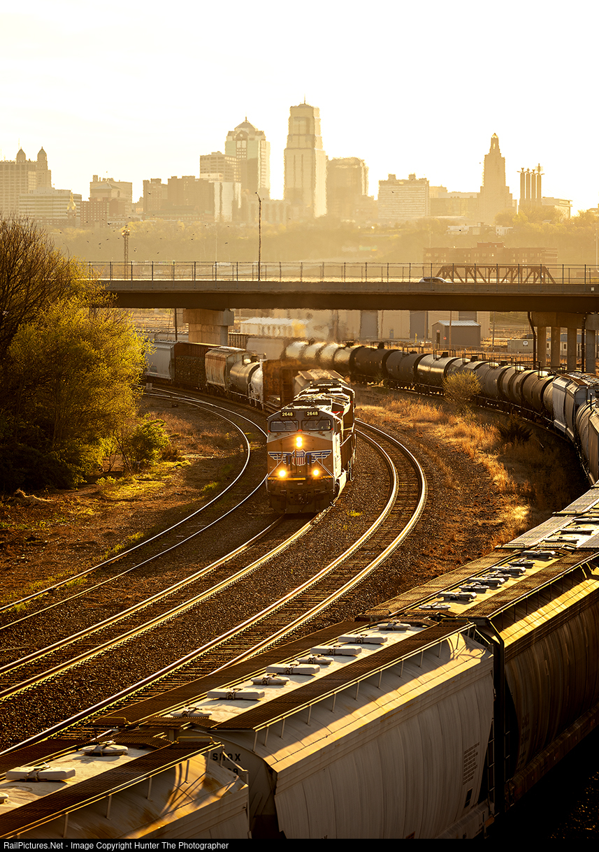AM At Armourdale | Forty minutes past sunrise on a windy Saturday, April 6, 2024, a westbound manifest train approaches Union Pacific's 18th Street Yard in Kansas City, KS. Having just crossed the state line, the skyline of downtown Kansas City, MO is prominent in the background.