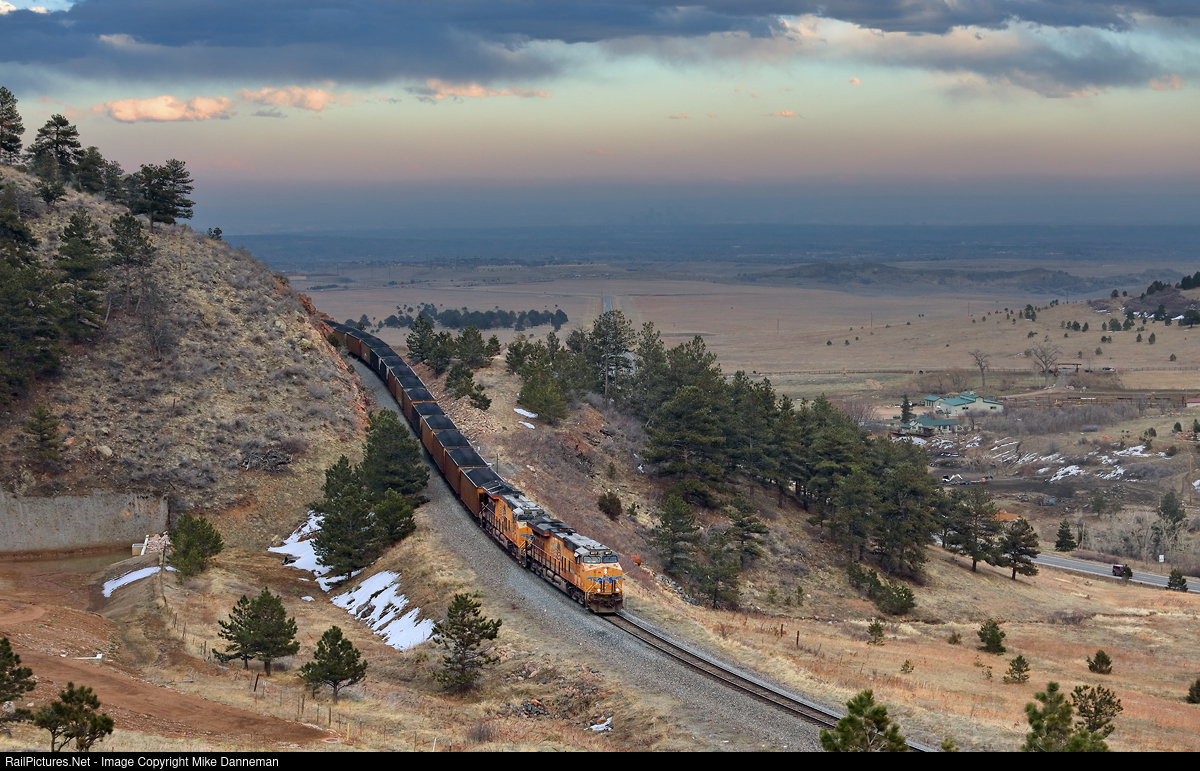 The sun has set on March 31, 2024, as an eastbound Union Pacific coal train slowly drops downgrade into the curve passing over the mouth of Coal Creek Canyon between Plainview and Eiesle, Colorado.