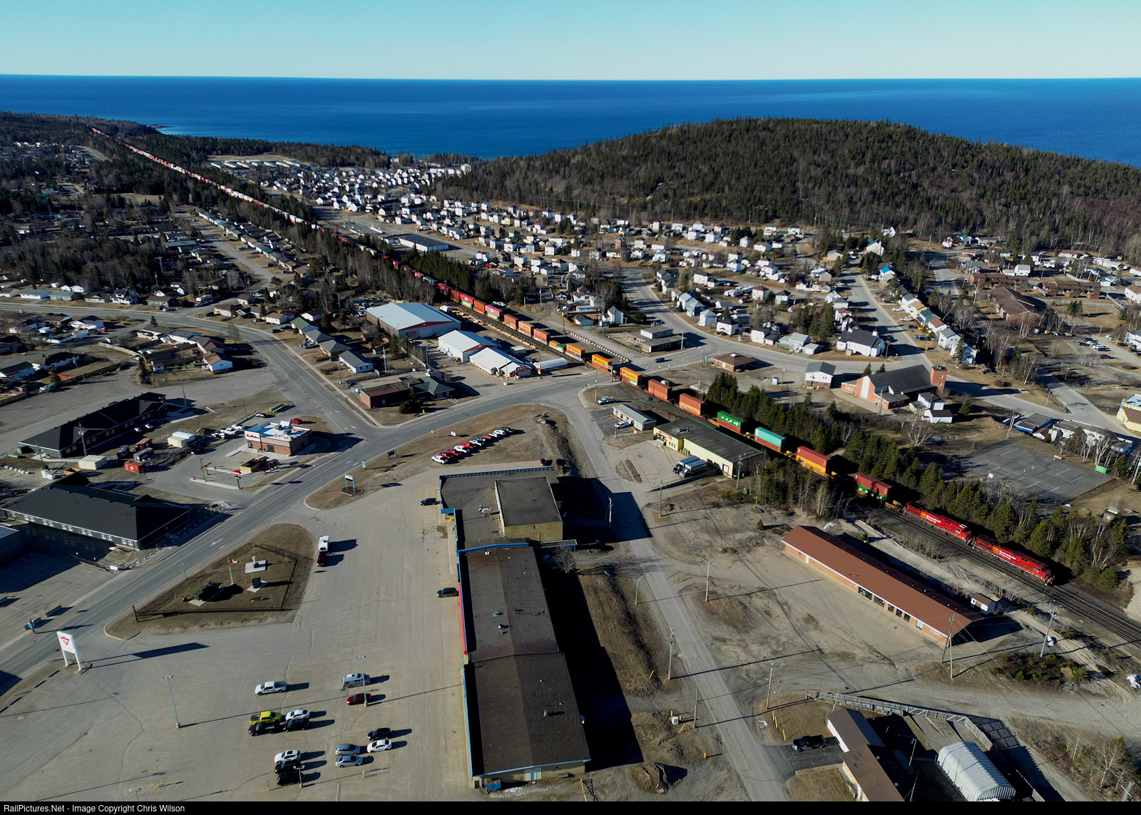 CP 8176 + CP 9727 have 113's train behind them passing through Marathon along the shores of Lake Superior.